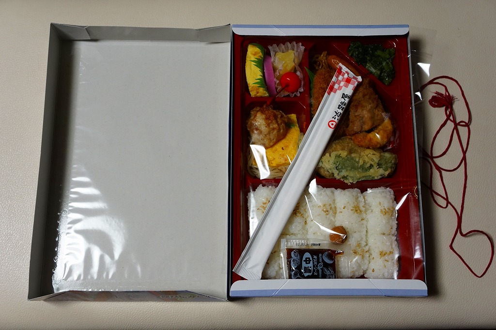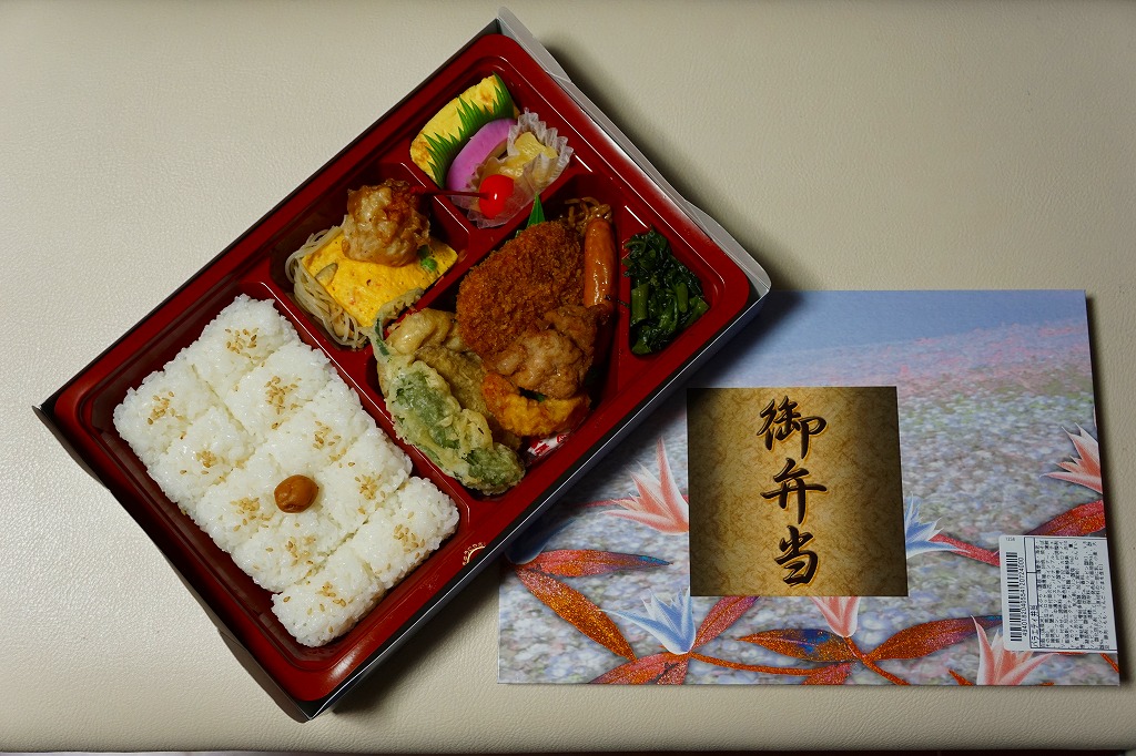 市販の仕出し弁当向け容器に、日の丸俵飯、サツマイモやレンコンなどの天ぷら、かぼちゃコロッケ、鶏唐揚、玉子焼、焼きそば、ウインナーなどを詰めたもの。つまり、俵飯に揚げ物主体のおかずを詰めた惣菜弁当。これも一緒に買った「たこめし二段重」も、調製元は駅弁で内弁当と位置付けた商品であるらしいが、このように駅弁売店で駅弁と同じように売られ、買われていく。京都エリアや神戸エリアでも、同じものが売られているのではないかと思う。