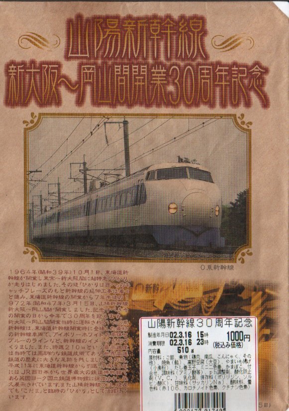 山陽新幹線新大阪・岡山間の開業30周年を記念して、新大阪・大阪・新神戸・西明石・姫路・相生・播州赤穂・岡山・福山・新尾道・尾道・三原・広島の13駅で2002年3月15日から、共通デザインの掛紙と約千円の価格で約2か月間の期間限定にて一斉に売り出した記念駅弁の、新大阪・大阪駅版。