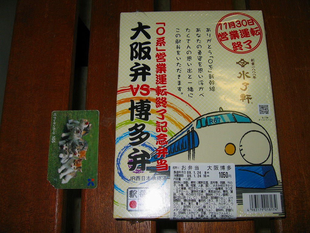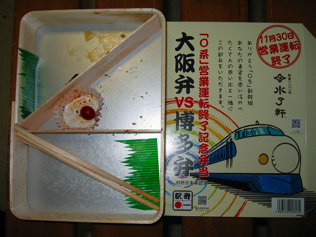 今回のパッケージのテーマは、2008年11月30日限りでの0系新幹線電車営業運転終了。これをテーマにした駅弁は沿線各地に出ているが、いずれもなぜか不思議と新幹線のイラストに編成番号「R67」を明記している。そんな業務用の表示はJR社員と鉄道ファンしか気にならない。0系新幹線電車は国鉄時代に登場しているため、JR西日本が0系新幹線の駅弁を承認する際に、JR西日本のオリジナルな点を入れる必要があったのだろうか。