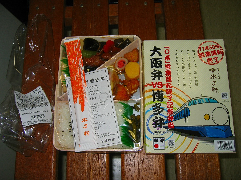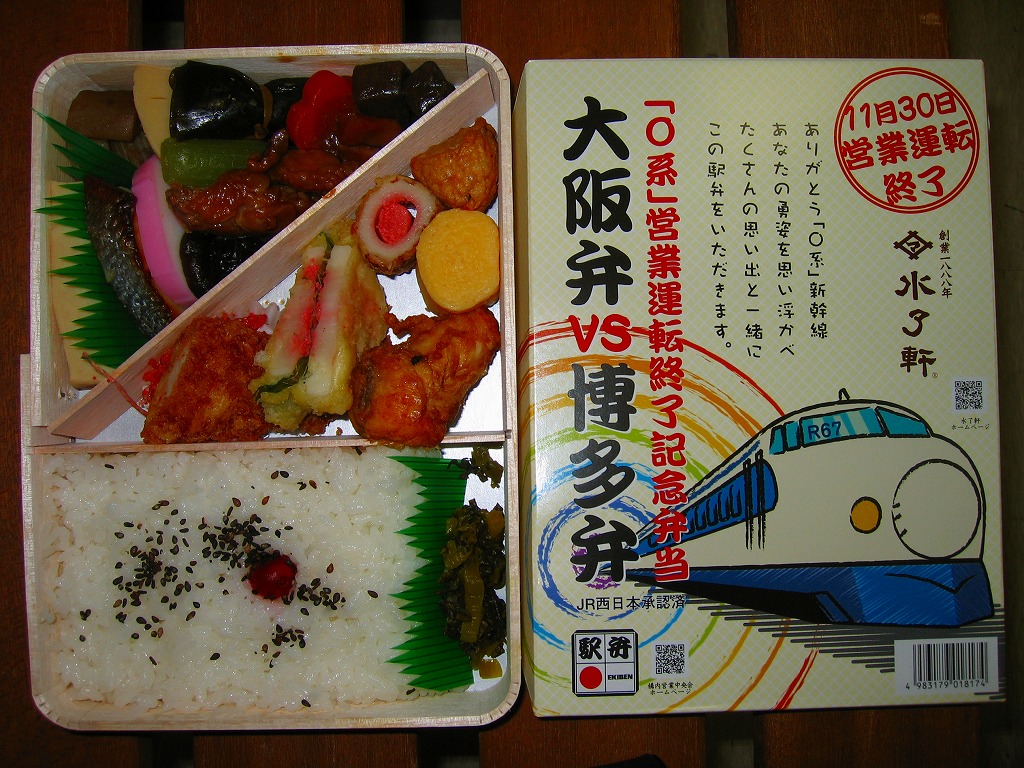 2006(平成18)年3月18日のJRグループ各社のダイヤ改正に合わせて発売。大きさと深さが昭和の駅弁らしい形状の経木枠容器にボール紙のふたをして、まるごとラップで包む。中身は日の丸御飯におかずがたっぷり。おかずの内容はしおりに書いてあり、博多の味としてフグ唐揚、レンコンの明太子挟み揚、春雨明太味、明太子ロール、高菜の油炒め、大阪の味として高野豆腐、玉子ロール、魚の幽庵焼、炊きかしわ、華カマボコ、たこ焼天、煮物を詰めている。