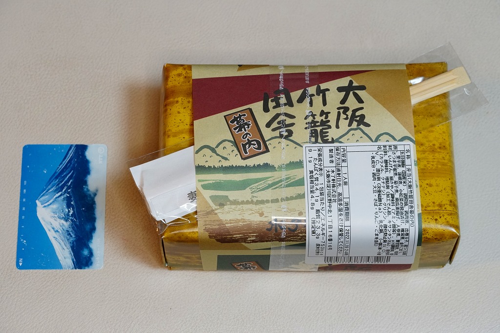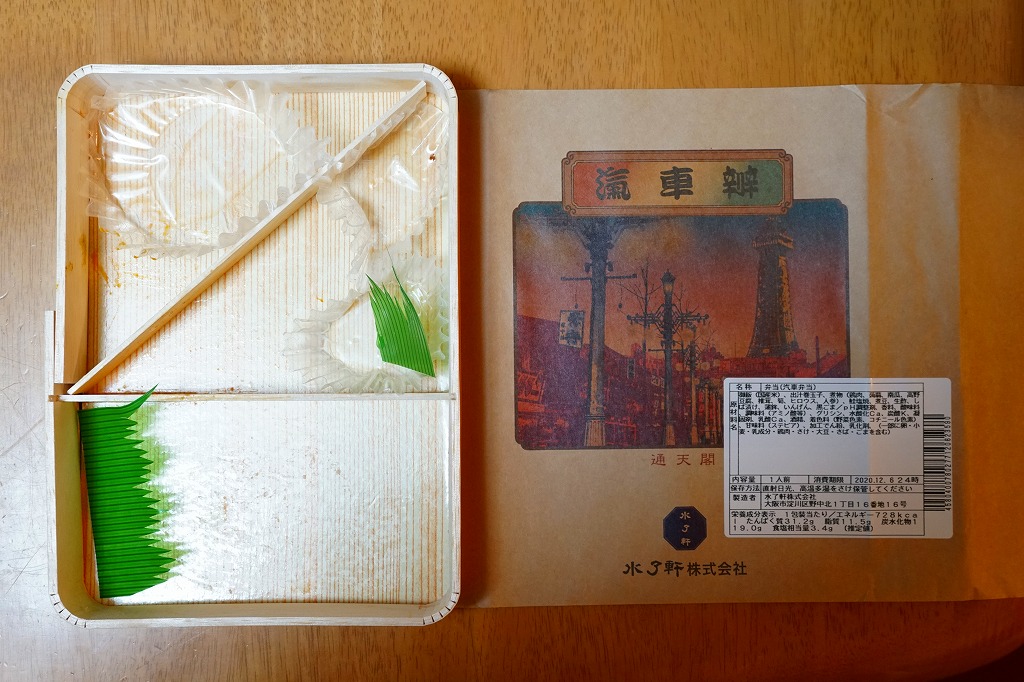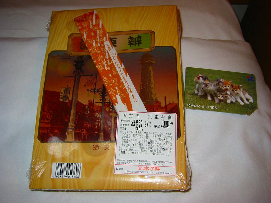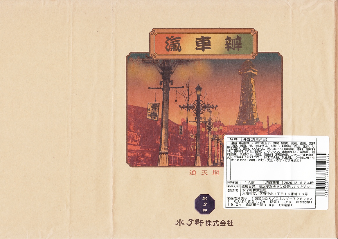 阪神百貨店の地下食料品売り場で購入。潰れた駅弁屋の商標を買い取った業者が発売。その姿は、下記のかつての大阪駅弁「汽車辨」に、とてもよく似ている。おそらく似せたのではないかと思う。駅弁サイズの経木折風容器に、俵飯と柴漬けを詰め、焼鮭、かまぼこ、玉子焼、鶏肉、煮物、ミニ大福などを添える。幕の内駅弁の味、大阪駅の駅弁の味が、ここに再現されていた。しかし、駅で売られることはない模様。