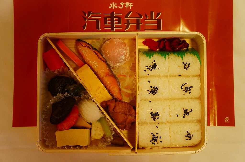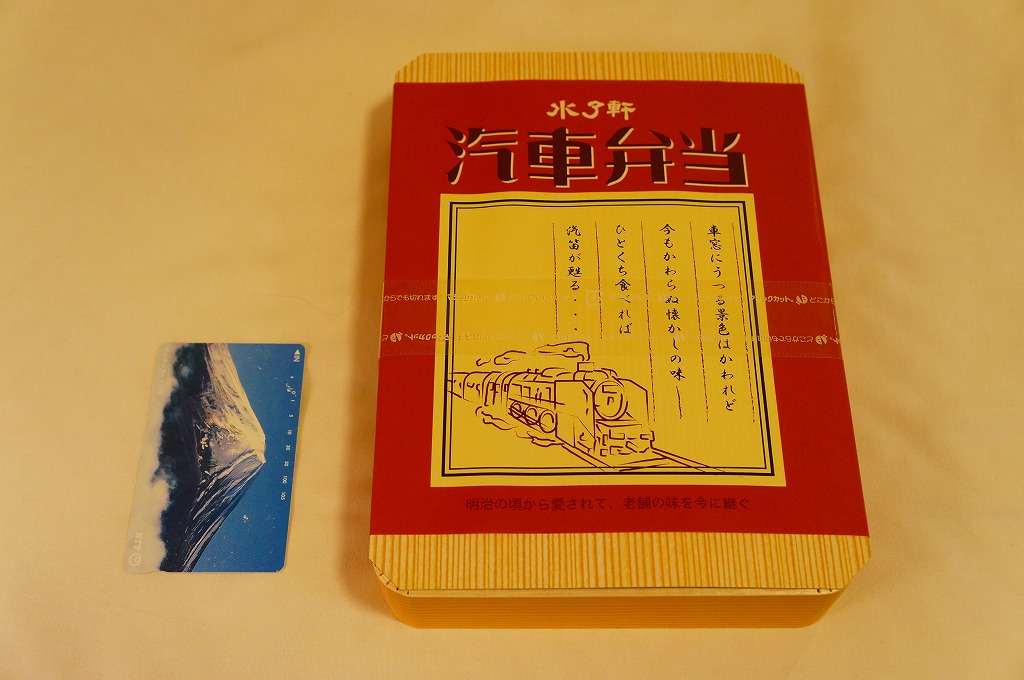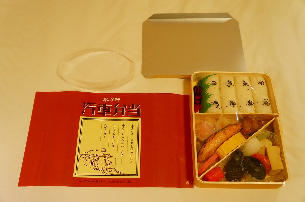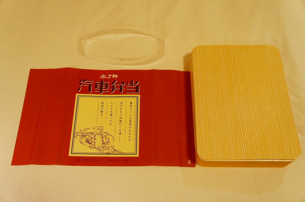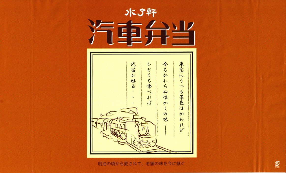 2019(令和元)年にこの姿になったものか。案内や宣伝は見当たらないが、これは2000(平成12)年に当時の水了軒が発売した駅弁を、新たな水了軒が「汽車弁当」の名で復刻し、さらに名前や掛紙の絵柄まで復刻したもの。