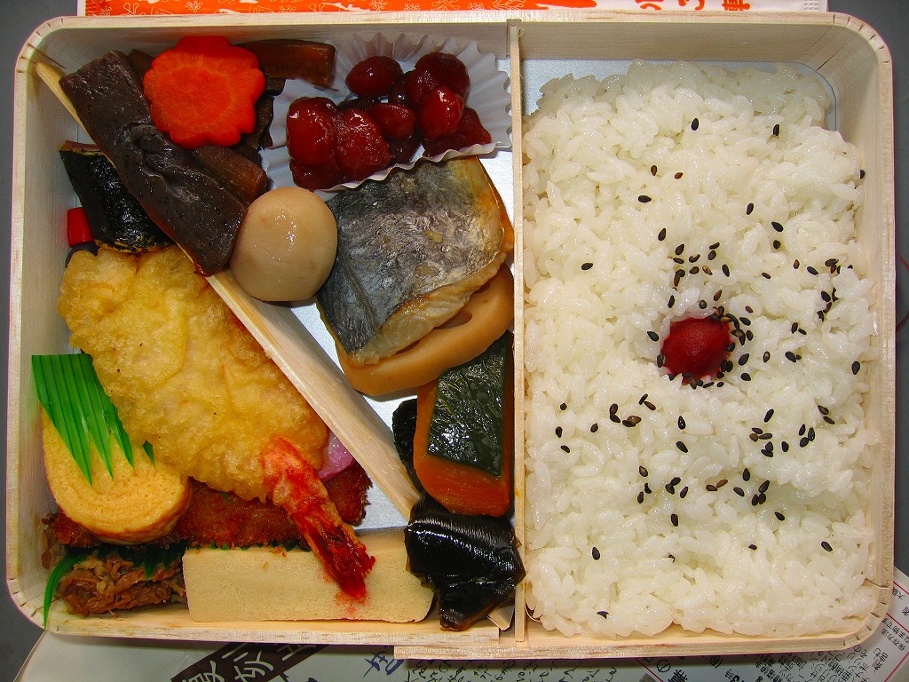 底を除き経木を使う長方形容器を使用、中身は胡麻振り俵型御飯に鮭の焼魚・蒲鉾・玉子焼が入る一般的な幕の内弁当も、容器内に隙間が目立つ代わりによく調理されて冷めてもおいしい多種多様な煮物揚物が乱雑に配置され、見栄えは悪いが味と量は悪くない駅弁。