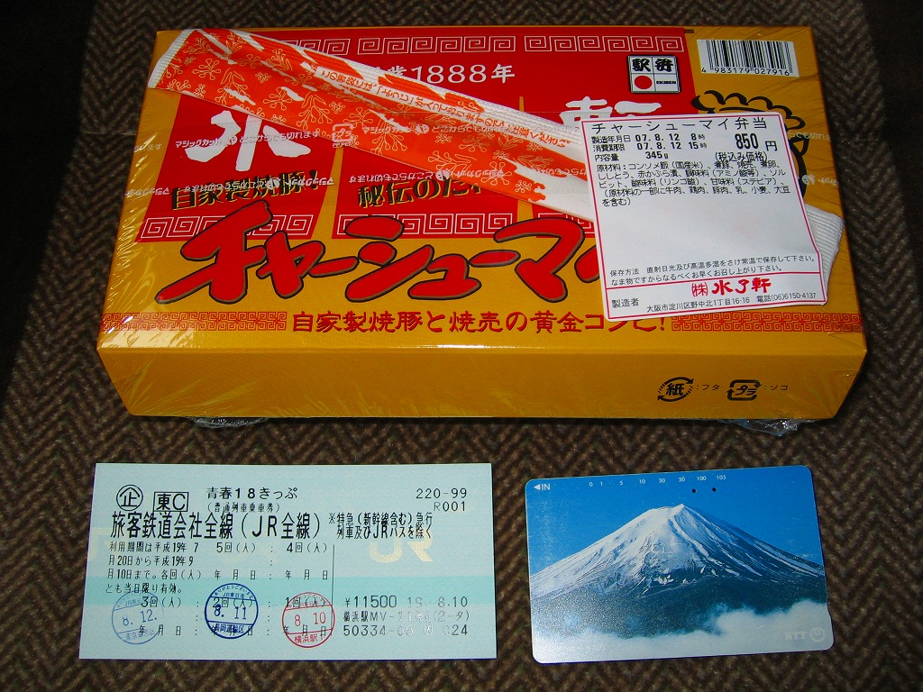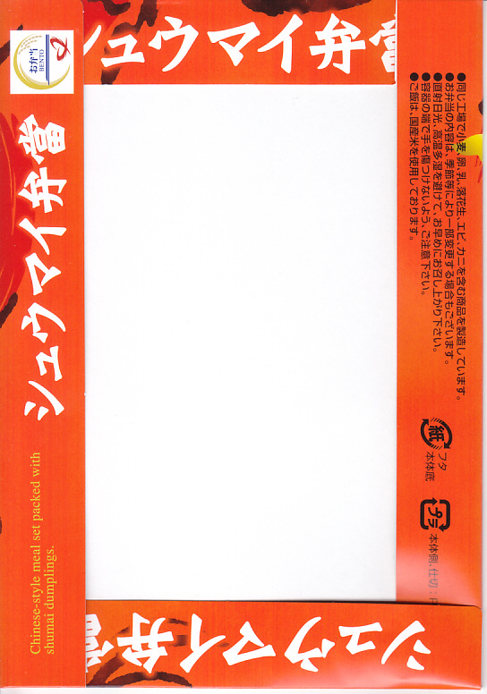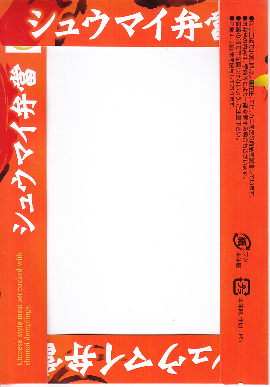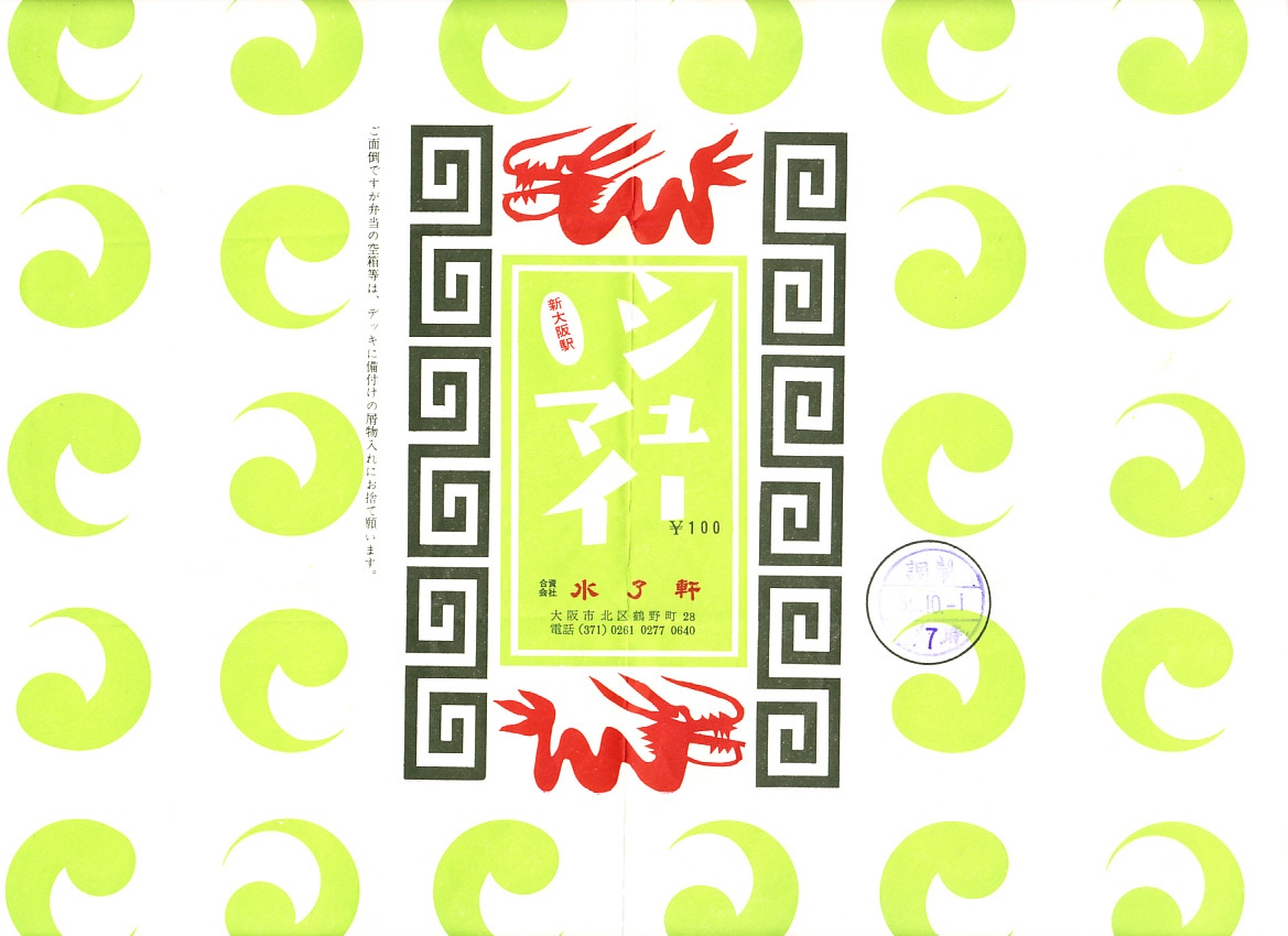 2018(平成30)年7月11日に購入した、新大阪駅弁のふた。上記の2019年のものと、中身や価格はまったく同じ。しかしふたをよく見ると、この時は「焼売は国産豚肉と干し帆立使用」とあり、後のものは「焼売は国産豚肉を使用」とあるので、シュウマイの味が違ったのかもしれない。