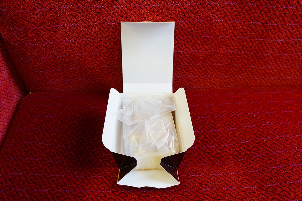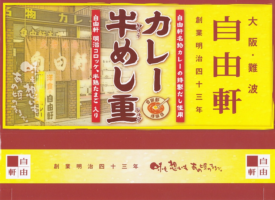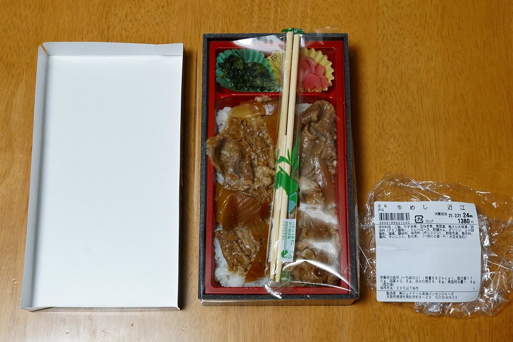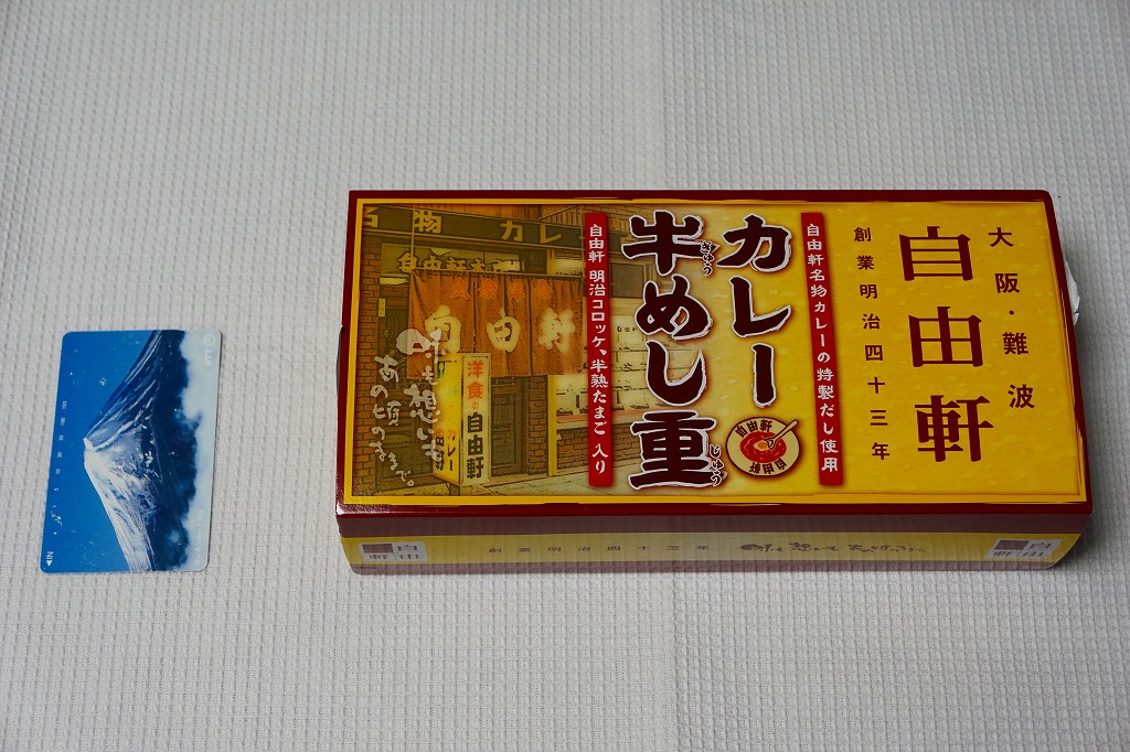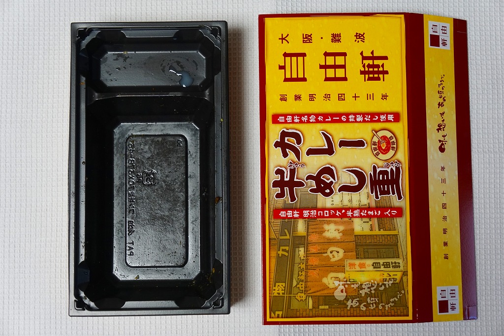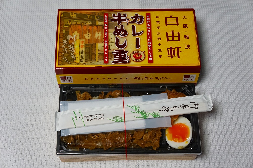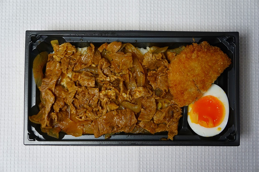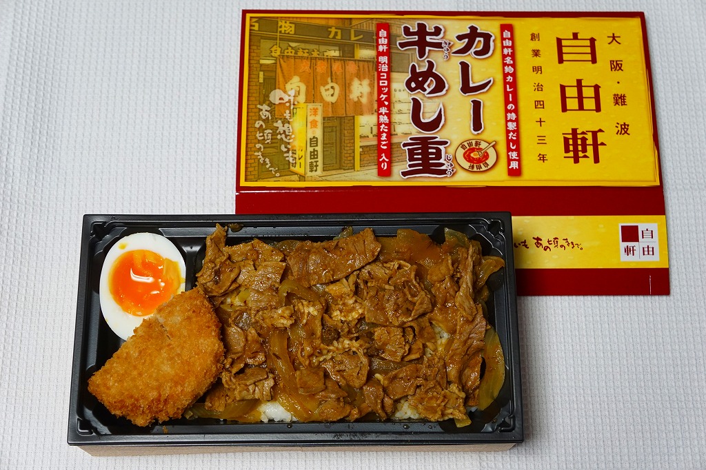 新幹線新大阪駅のコンビニで買えた弁当。駅では2017(平成29)年に発売か。大阪初の西洋料理店として難波で創業したというカレー屋のブランドを名乗る牛肉弁当。白飯にカレーをかけ、コロッケと半熟卵を添える。カレーは弁当向けなのか、ルーがほぼない牛肉とタマネギのペーストである。非常に混雑する駅のコンビニでの冷蔵販売では、カレーの味や香りが控えめ。これは暖めて食べてみたい気がした。2019年までの販売か。