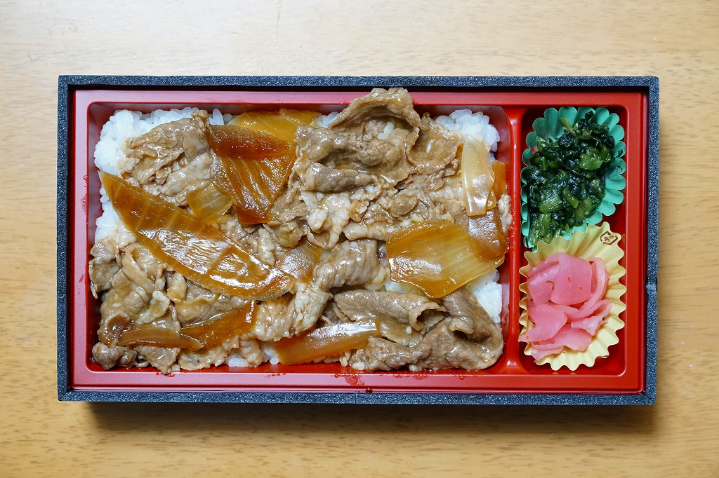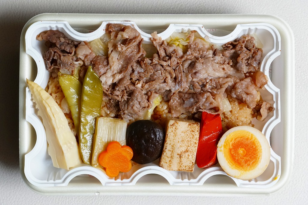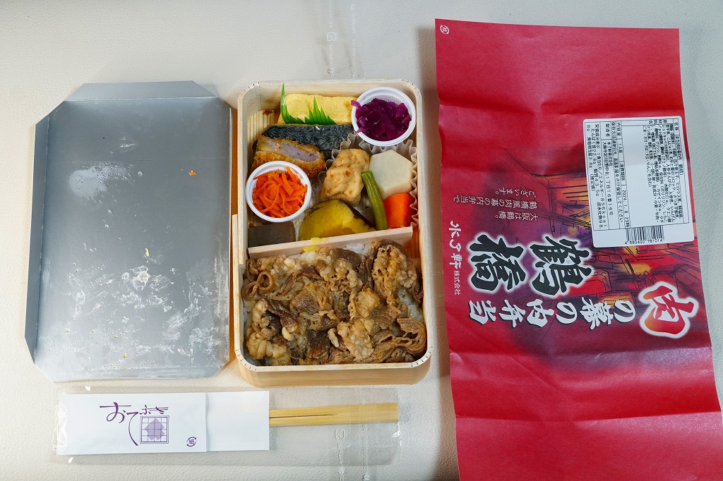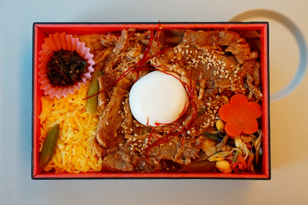 外が黒く中が赤い長方形の容器の全面に茶飯を詰め、牛焼肉、錦糸卵、ナムル、高菜漬で覆い、半熟ゆで卵風の加工卵を据える。そんな姿と内容は、焼肉の写真が美しい黒地の掛紙を含め、過去に駅弁の催事や輸送販売で何度も見たり食べたりしたような、既視感の塊。大阪などの関西や鹿児島の味ではないと思う。870円で買えるのならば、お得だとは思う。半年間ほどの販売か。