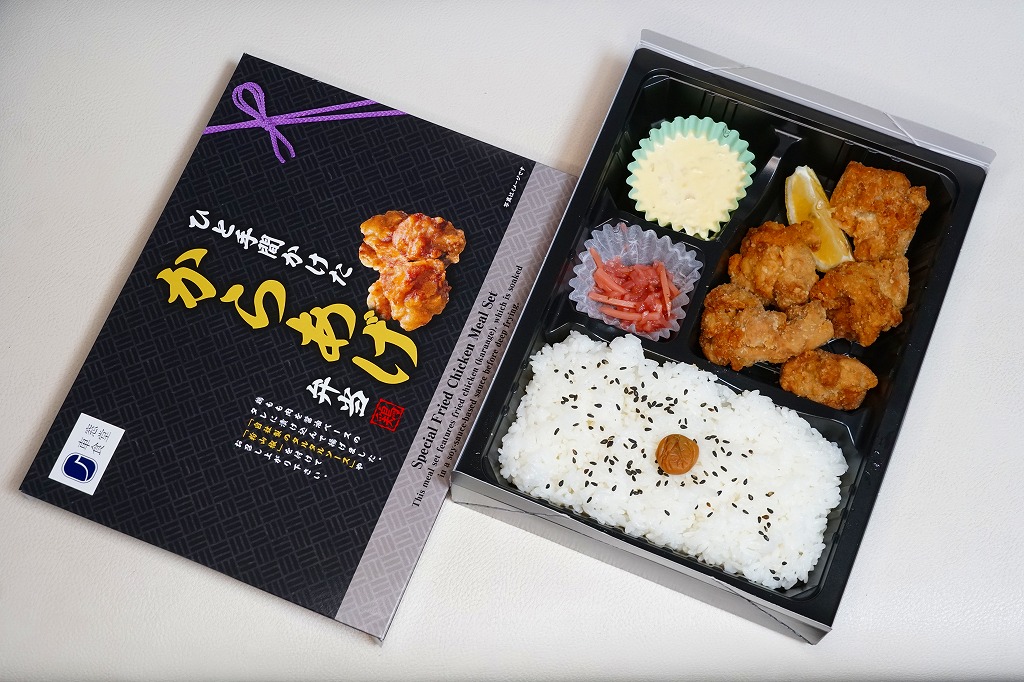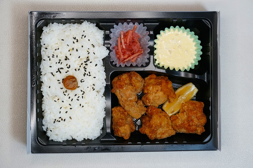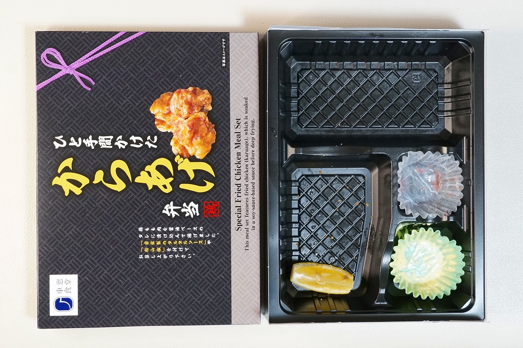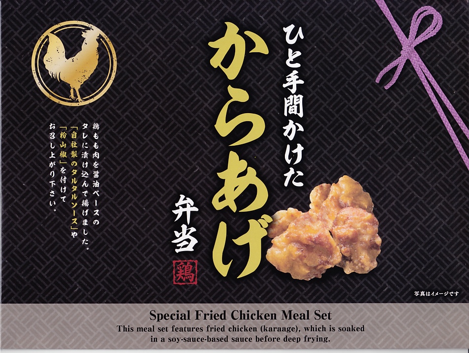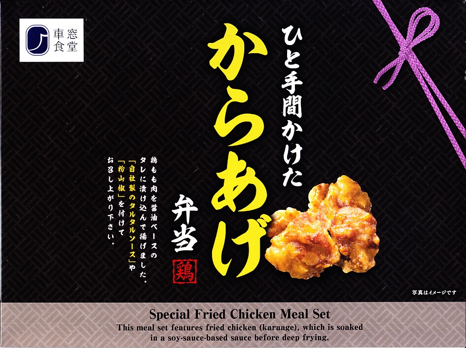 2018(平成30)年の春に新大阪駅と京都駅で発売か。2022年中に名古屋駅や東京・品川・新横浜の各駅でも売られるようになった。黒いボール紙箱に収めた真っ黒なトレーに、日の丸御飯を詰め、鶏唐揚を6個も散らし、レモンと漬物とタルタルソースを添える。実質的に飯と鶏唐揚しか入らない、JRCPの駅弁らしからぬ潔さ。鶏もも肉を醤油ベースのタレに漬け込んで揚げたという鶏で御飯をいただく。価格は2021年の発売時で900円、2022年1月27日から930円、2023年時点で1,000円、秋の時点で1,080円。2024年に「からあげ弁当−相性抜群!タルタルソース−」へリニューアル。