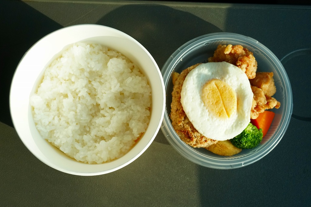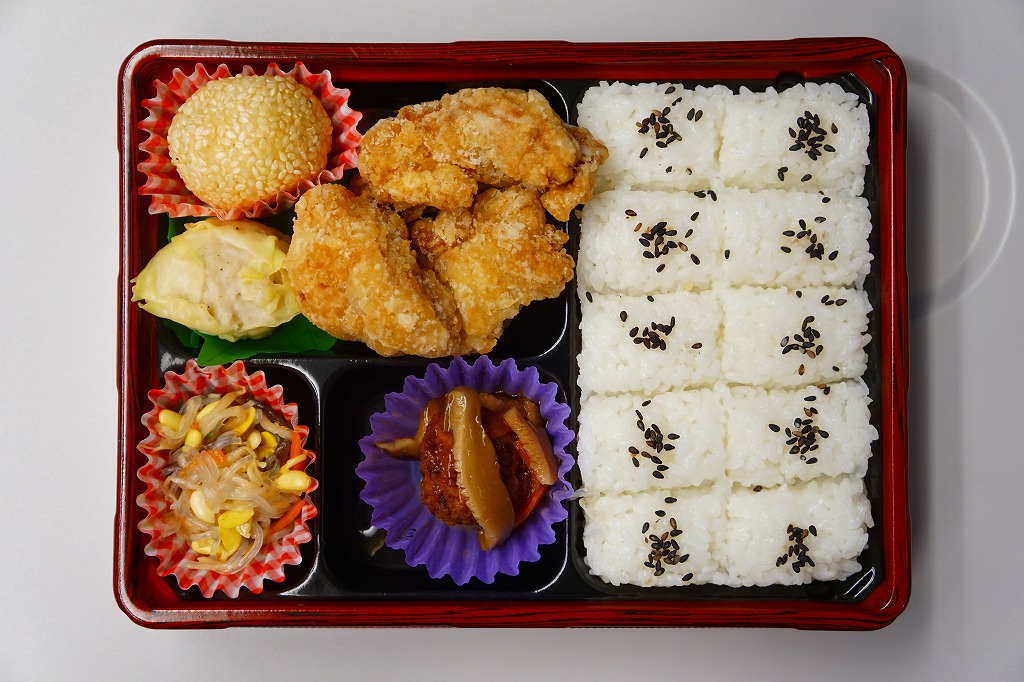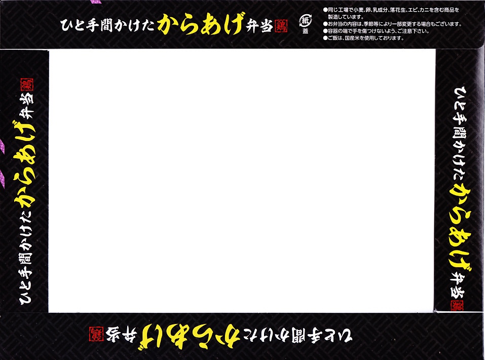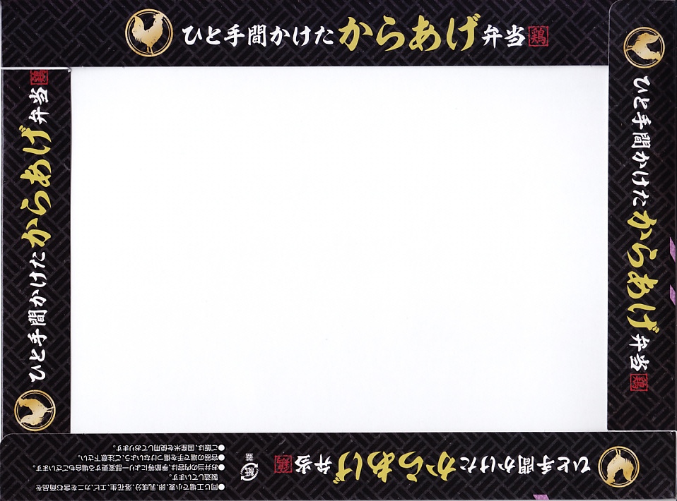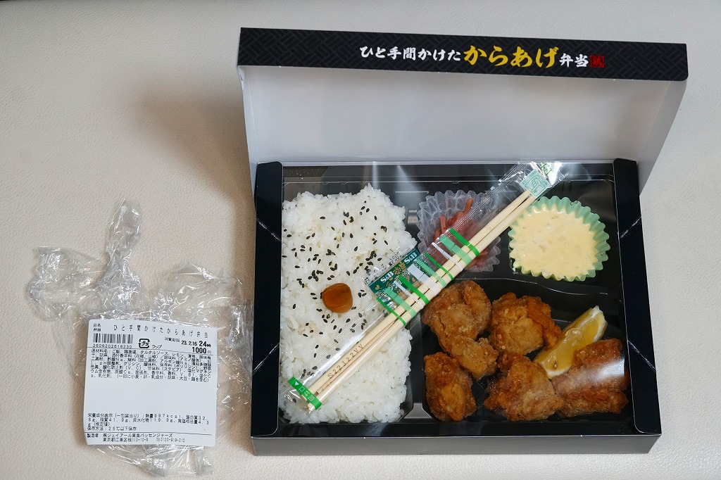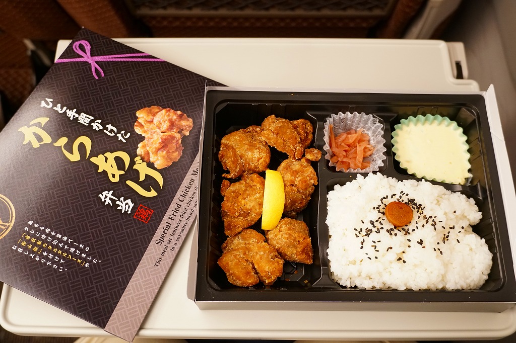 2018(平成30)年の春に新大阪駅と京都駅で発売か。2022年中に名古屋駅や東京・品川・新横浜の各駅でも売られるようになった。黒いボール紙箱に収めた真っ黒なトレーに、日の丸御飯を詰め、鶏唐揚を6個も散らし、レモンと漬物とタルタルソースを添える。実質的に飯と鶏唐揚しか入らない、JRCPの駅弁らしからぬ潔さ。鶏もも肉を醤油ベースのタレに漬け込んで揚げたという鶏で御飯をいただく。価格は2021年の発売時で900円、2022年1月27日から930円、2023年時点で1,000円、秋の時点で1,080円。2024年に「からあげ弁当−相性抜群!タルタルソース−」へリニューアル。