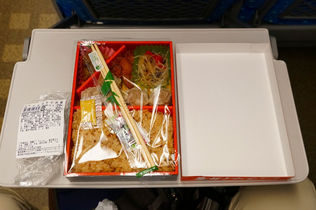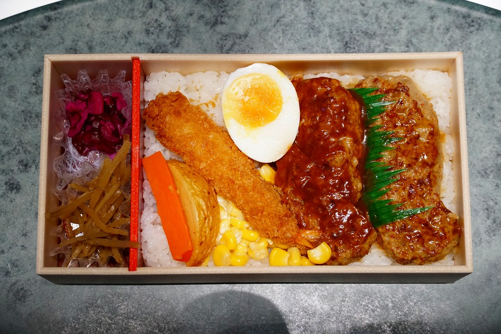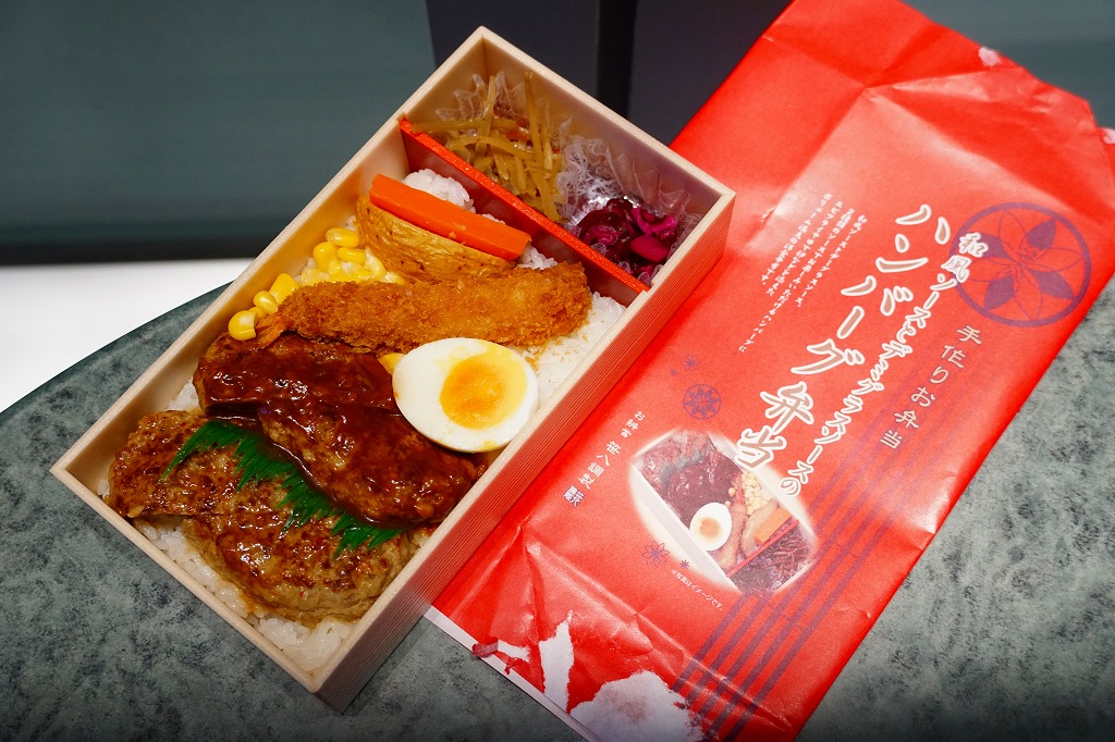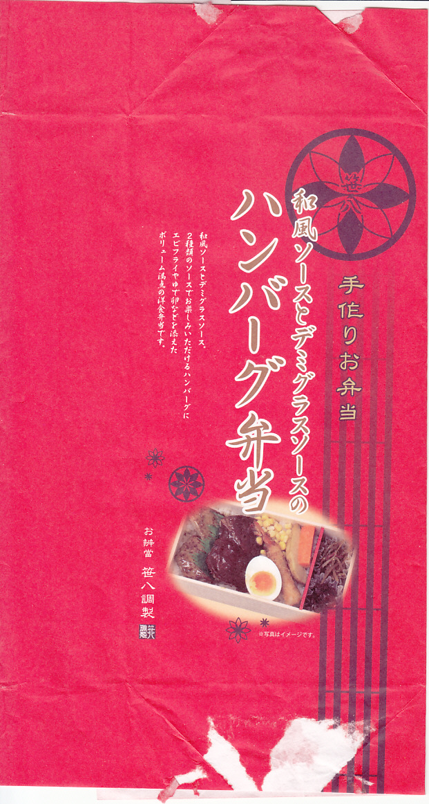 これは大阪で購入したが、東海道新幹線のぞみ号停車駅の各駅その他、三大都市圏の商業施設で手広く売られる、「笹八」「ゐざさ」「中谷本舗」ブランドの弁当群のひとつ。それなのに奈良県吉野の山の中で作っていることになっている不思議な商品。白飯にハンバーグ2個、エビフライ、ゆで卵とポテトフライとニンジンとコーンを置き、きんぴらごぼうと柴漬けを添えるお弁当。折箱を包装紙で包み、この内容で千円を切り、本物の駅弁よりも上品でお得に見えてくる。駅弁を知ったり語らないのであれば、新幹線でも食べられる良い弁当。
