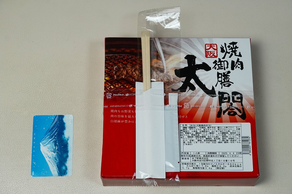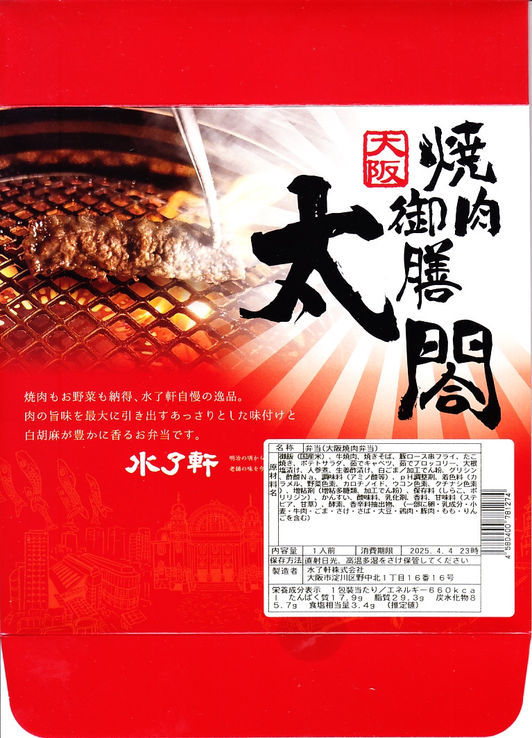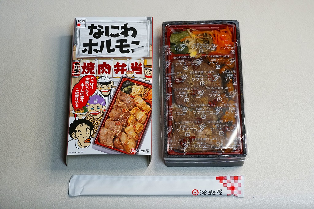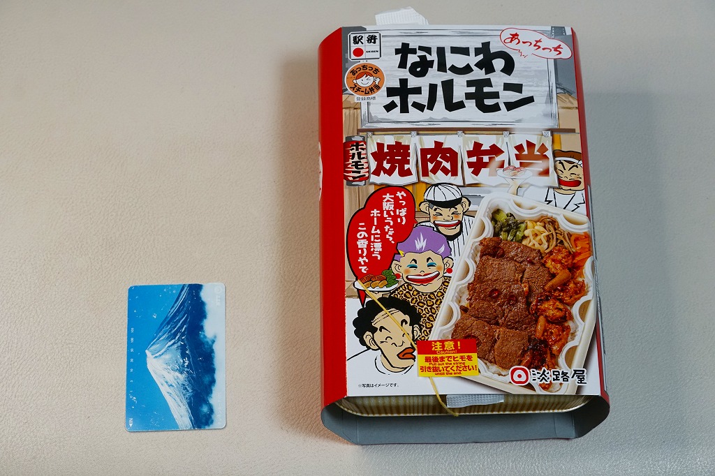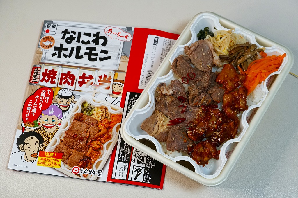 2022(令和4)年の秋までに新大阪駅などで発売か。昭和時代の並等幕の内駅弁のようなサイズの折箱で、白飯を詰めて牛焼肉で覆い、焼サバ、玉子焼、コロッケ、サトイモやニンジンなどの煮物、赤キャベツの甘酢漬け、ニンジンきんぴら、さつまいもを詰める。幕の内駅弁を焼肉で煙る鶴橋に持っていけばこうなるのだ、と語ってきそうな商品名と掛紙の絵柄と内容を持つ、おかずの多い焼肉弁当。