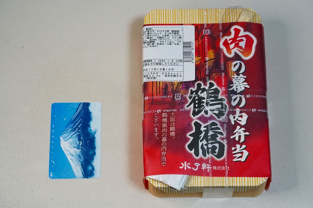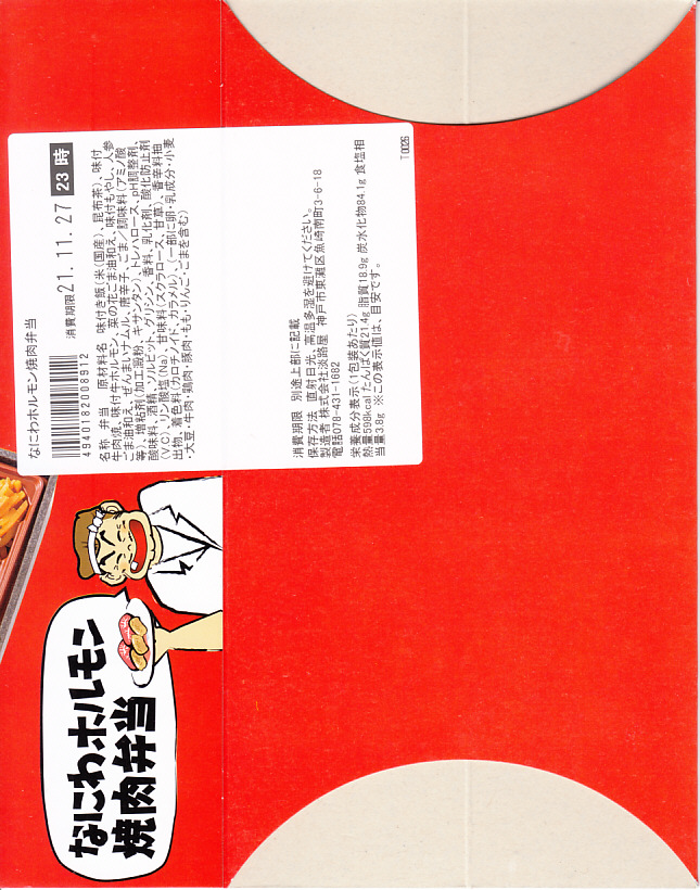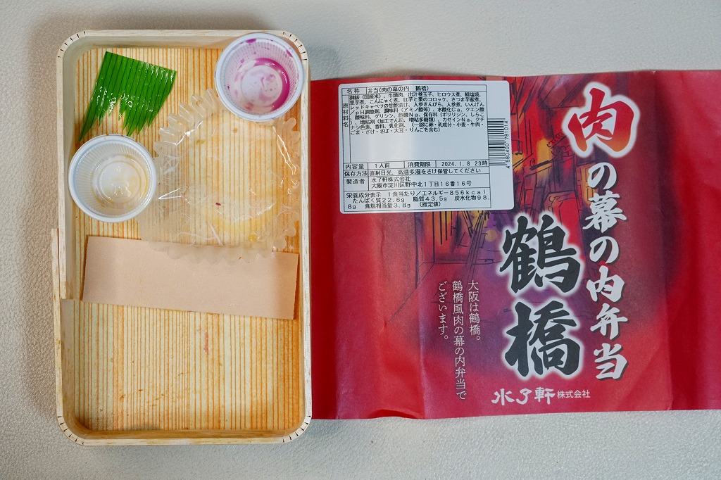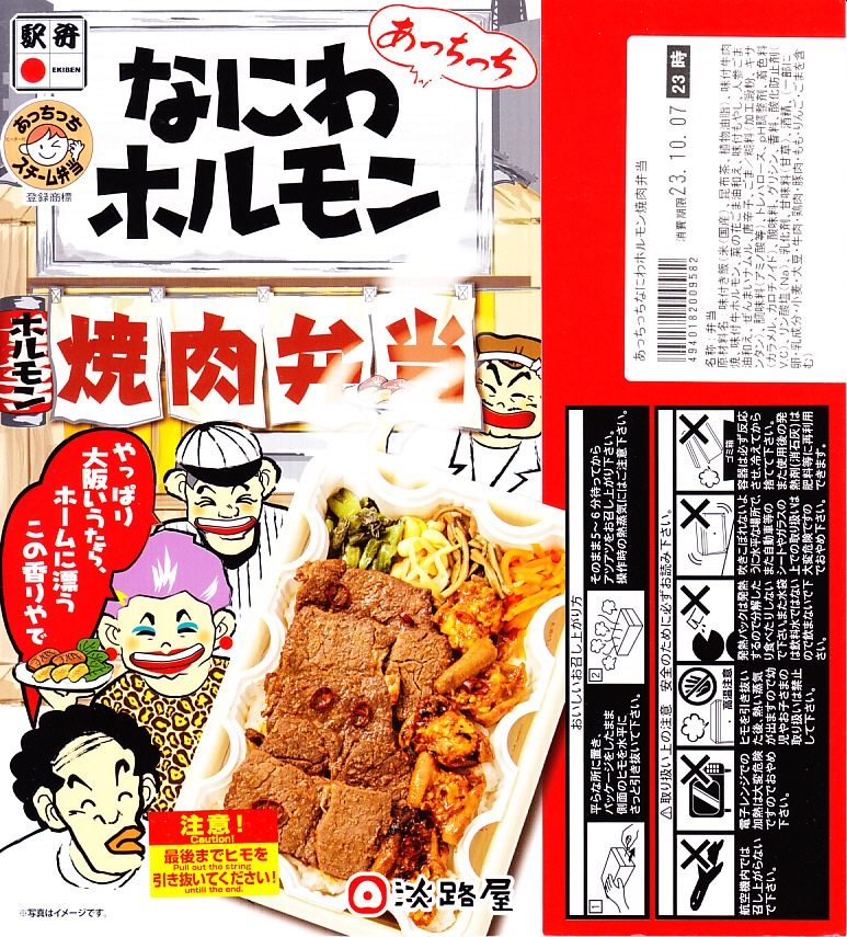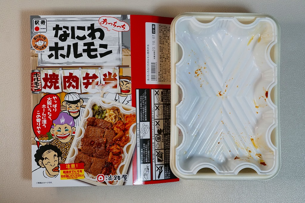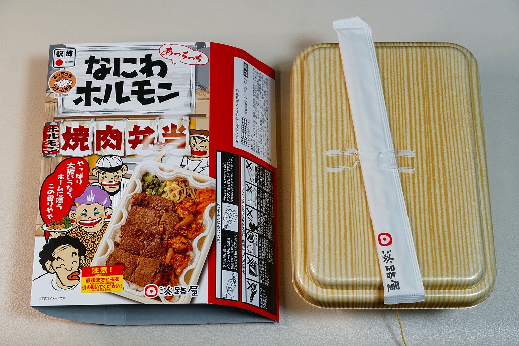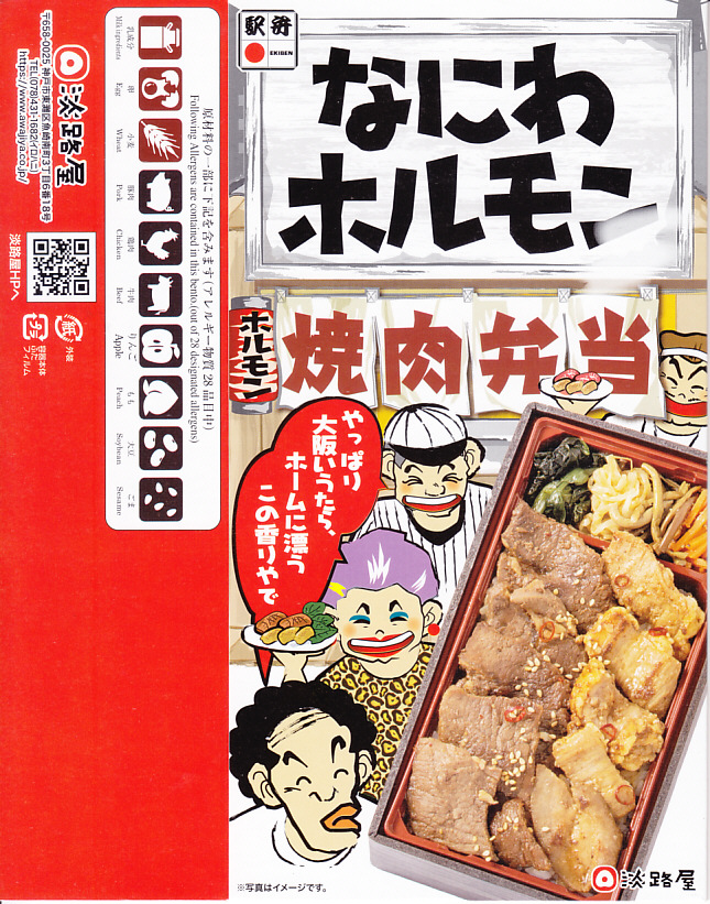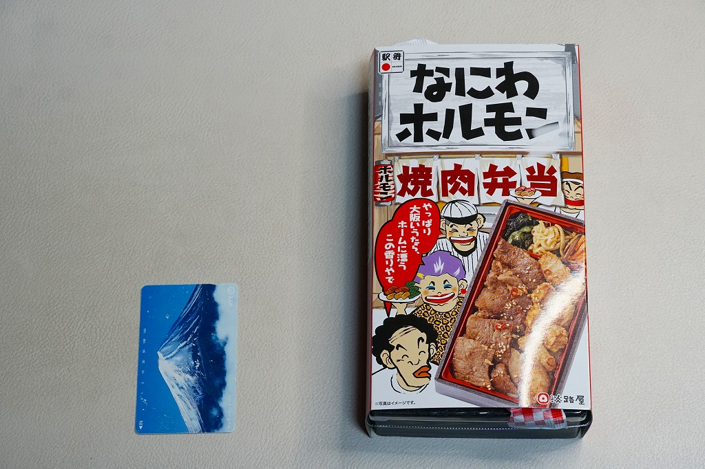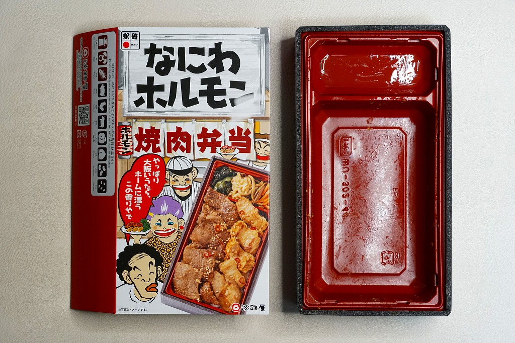 2021(令和3)年9月の発売か。スリーブの写真のとおり、白飯にホルモン焼肉を、味付けの牛肉とホルモンを焼いたものを並べ、菜の花、もやし、にんじんの油物を添える。みそ味と唐辛子で強い味付けと匂いを持たせたとはいえ、こういう癖のある食材と内容を、駅で市販するので一般受けすることが求められると思う駅弁に、よくできたものだと思う。どうも人気の駅弁になったようで、翌2022年4月には“本場”の鶴橋に駅弁売店ができた。調製元は神戸の駅弁屋。駅弁の名前やスリーブの表記から、主に大阪で売られる駅弁と思われる。2024年までの販売か。