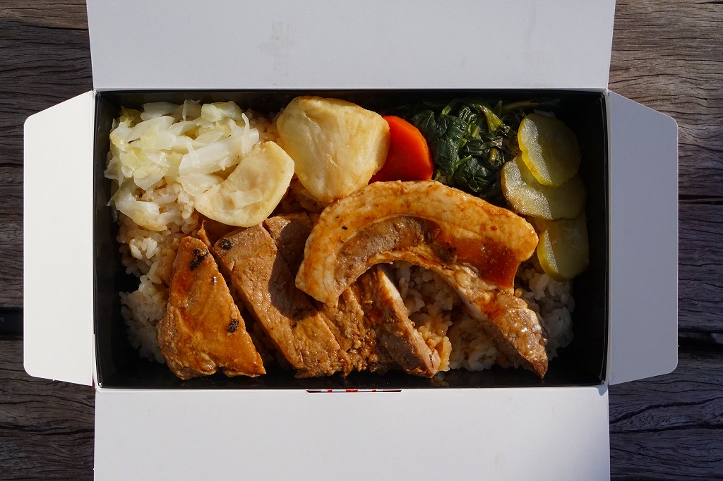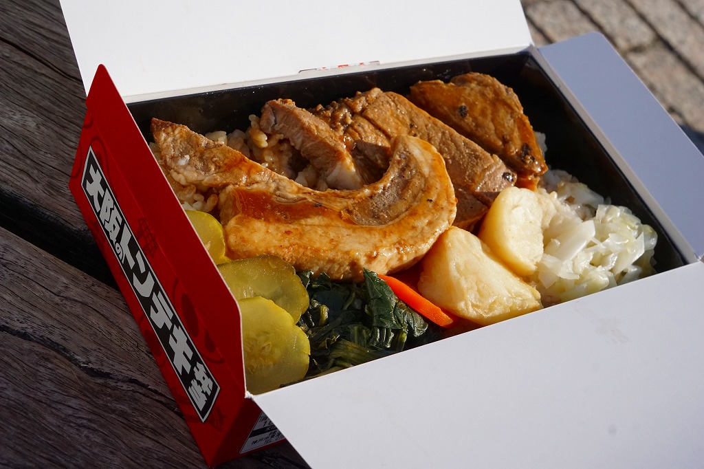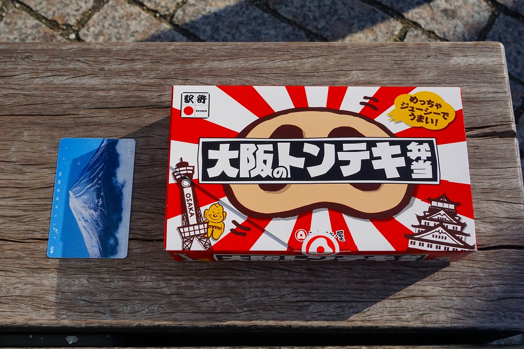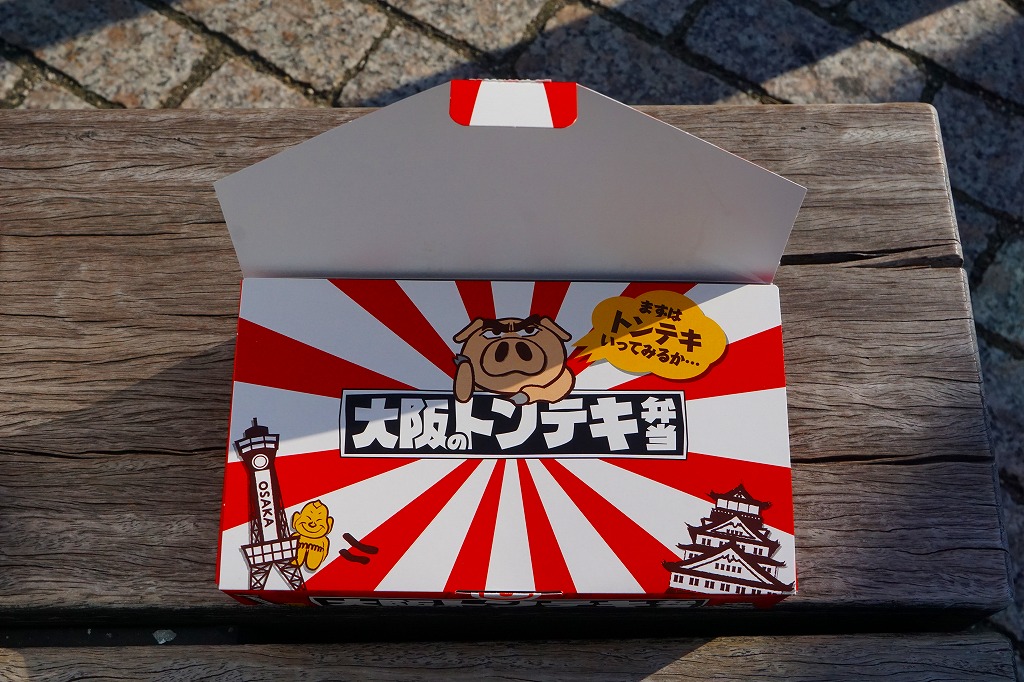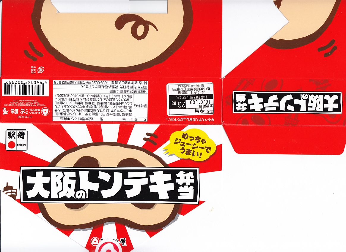 2015(平成27)年7月の発売。調製元は神戸の駅弁屋だが、パッケージには「JR大阪駅」と書いてある。通天閣と大阪城と豚を描いた、大阪らしい絵柄のパッケージに詰めた黒い紙製トレーに、醤油飯を敷き、豚肉ステーキ、ジャガイモの素揚げ、キャベツのマリネ、ホウレンソウのごま油炒め、ピクルス、ニンジン煮を載せる。
