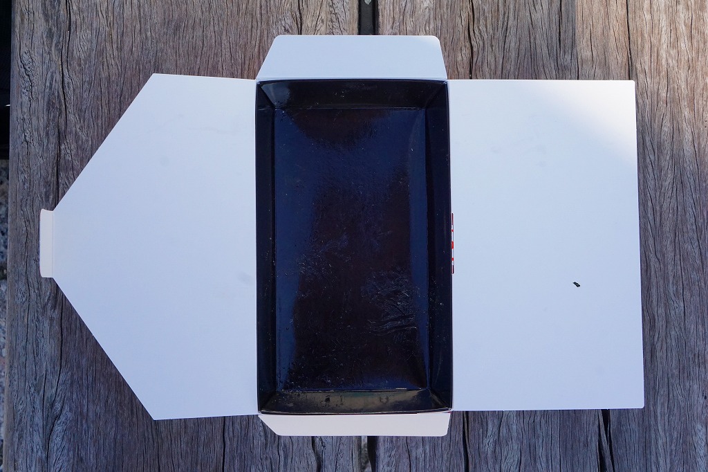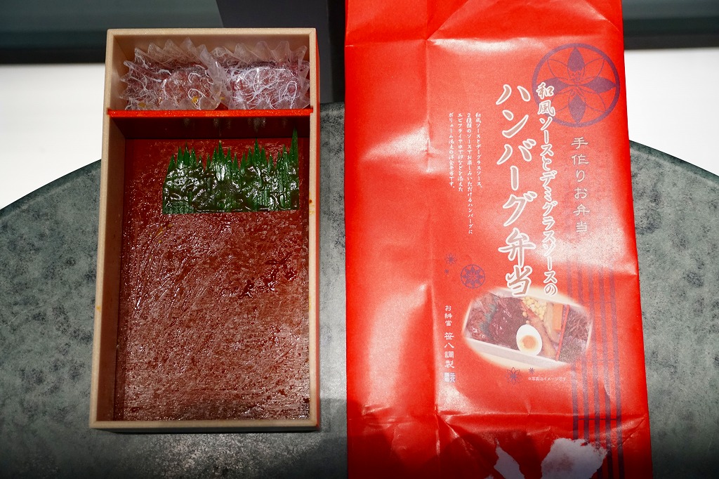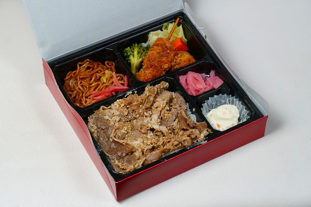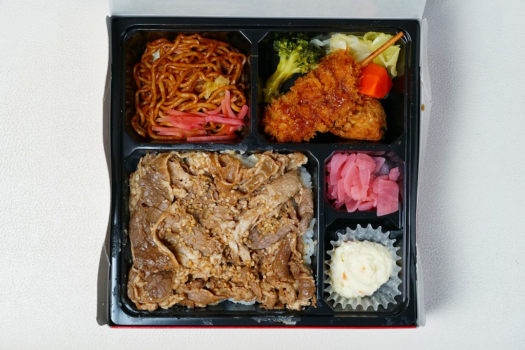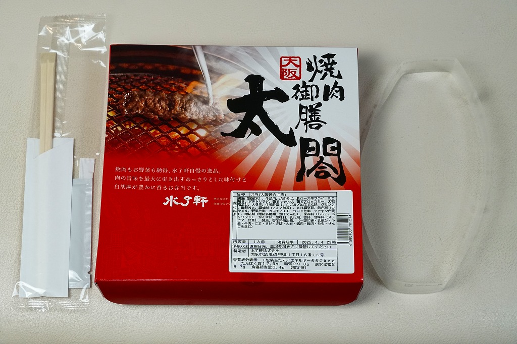 焼肉イメージの赤い紙箱に詰めた黒いプラ製トレーに、白御飯を詰めて牛焼肉で覆い白胡麻を振り、焼きそば、串カツ、たこ焼き、ブロッコリー、ゆでキャベツ、ポテトサラダ、大根桜漬を添える。調製元の通販サイトで「大阪名物、串カツ、たこ焼き、焼きそばとこだわりの焼肉を詰め込んだ自慢の品です。」としたとおり、わかりやすい大阪を詰めたのだと思う。