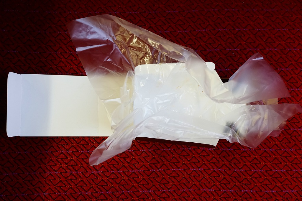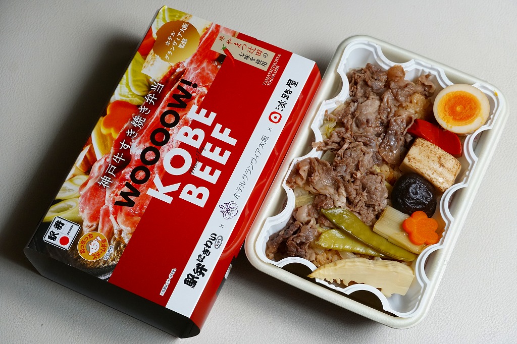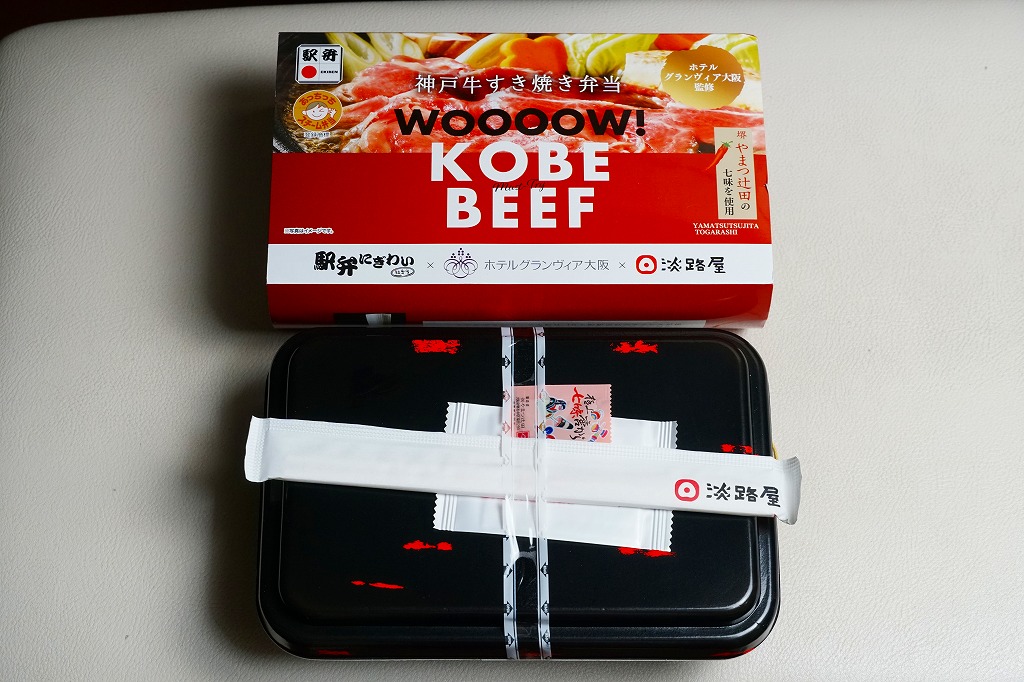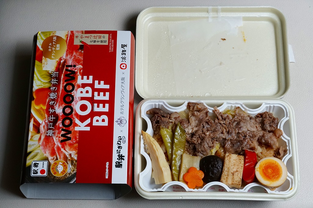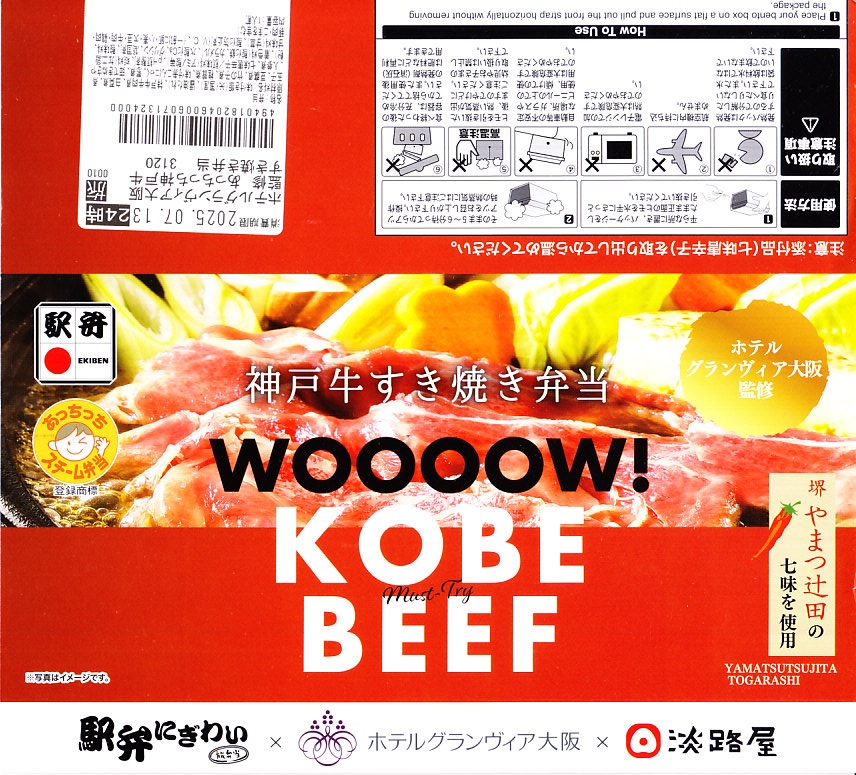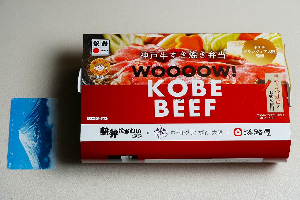 実物を見れば、いままでもたくさん出てきた神戸駅弁のすき焼き弁当の新作にみえる。長方形の加熱機能付き容器に、すき焼きの割り下風のだしで炊いたご飯を詰め、ゆでキャベツを敷いた神戸牛のすき焼きで半分を、たけのこ、きぬさや、白ネギ、花にんじん、しいたけ、焼豆腐、赤こんにゃく、煮卵の具で半分を覆い、やまつ辻田の極上七味唐辛子を添付。味でも量でもお肉が控えめだと思い、具の組合せと味付けの全体で味わうものだろうと感じた、全部まるごと牛すきやき御飯。スリーブで「WOOOOW!」と叫んでいるのは、何だろうか。