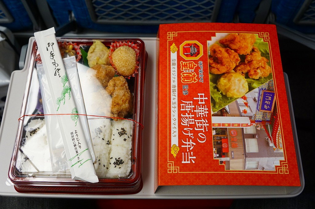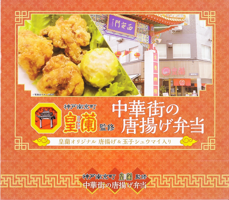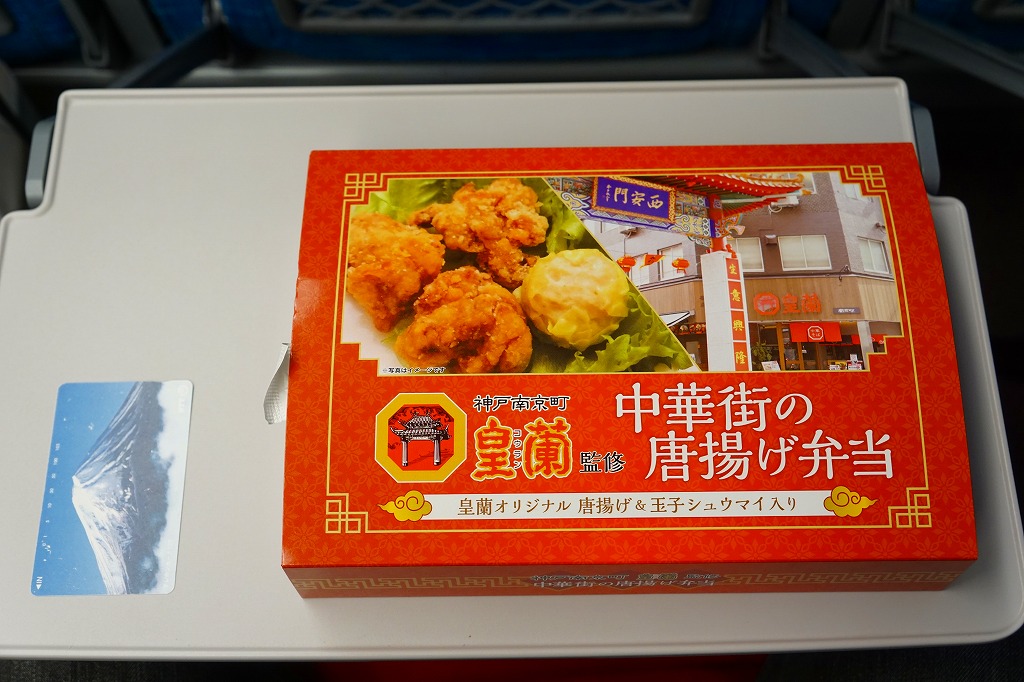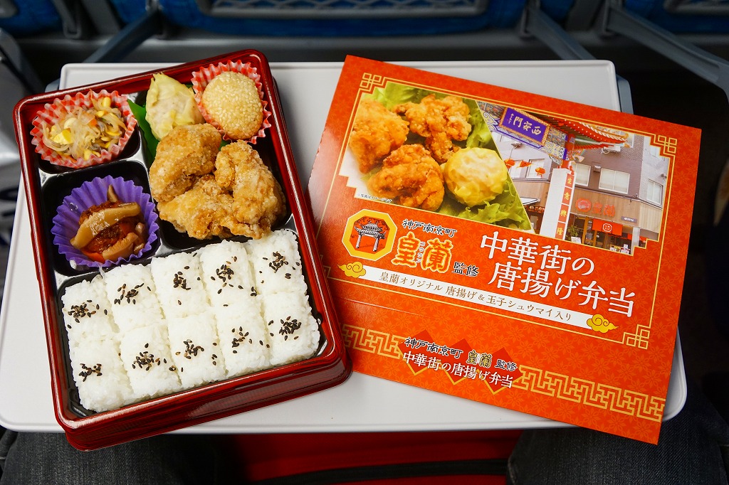 新幹線新大阪駅のコンビニで買えた弁当。駅弁売店に加えてJR子会社のコンビニでも、駅弁のような弁当が売られていた。スーパーの惣菜弁当に使われるようなプラ製容器を収めるスリーブには、神戸中華街と唐揚げの写真が使われる。中身は俵状の型押し白飯、鶏唐揚3個、焼売、中華サラダ、あんかけ肉団子、ごま団子。見た目は駅弁風で、「神戸南京町皇蘭監修」という味はコンビニ弁当。2018年以降に売られたか分からない。2020年限りで終売か。