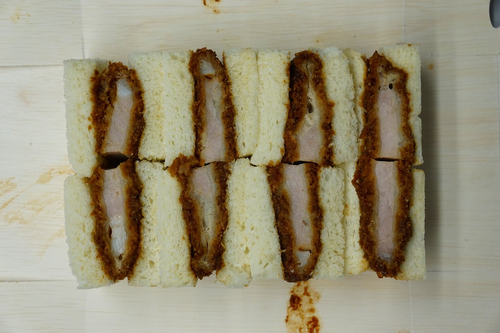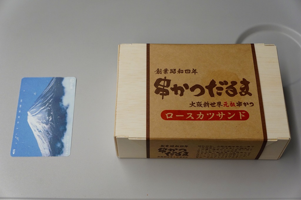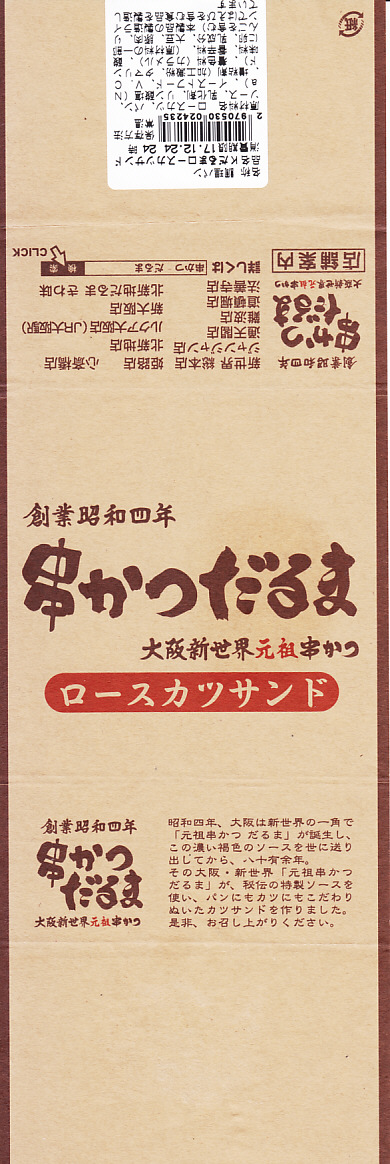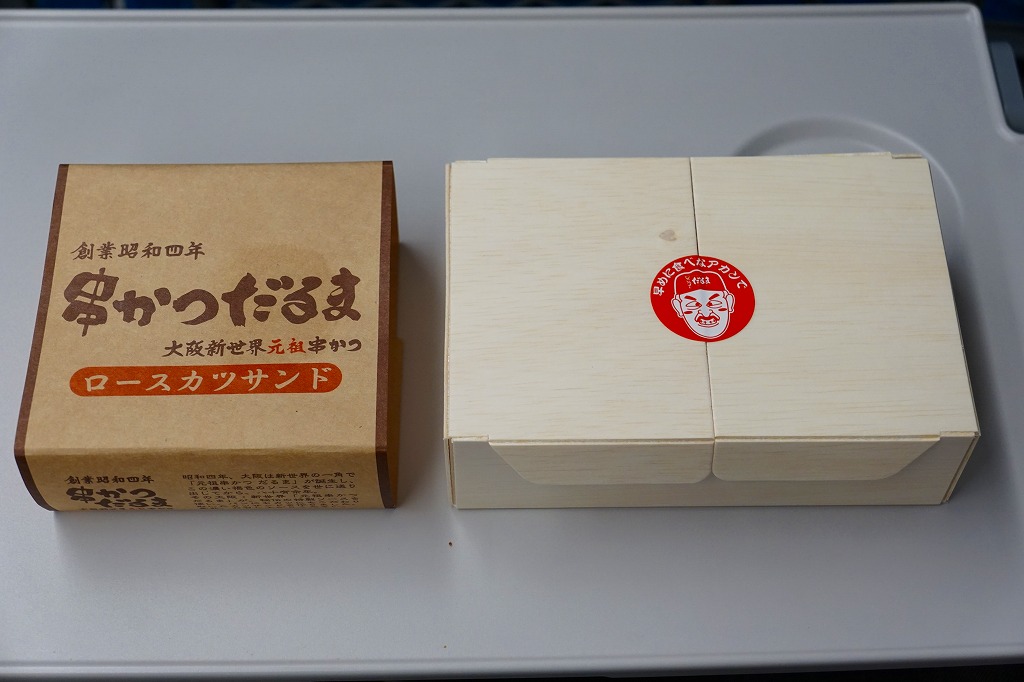 新幹線新大阪駅のコンビニで買えた商品。駅では2014(平成26)年に発売か。今は大阪名物となった串カツの発祥とされ、現在は大阪市内やその近隣にチェーン店を展開する、大阪は新世界の串カツ屋のサンドイッチ。木製のエコ容器に、ロースカツのソース漬けを耳なし食パンに挟んだサンドイッチを、4切れ分で8個収める。そのソースが「串かつだるま」のものなのだろう。どろっとした塩辛さ。価格は2017年の購入時で750円、2025年時点で900円か。
