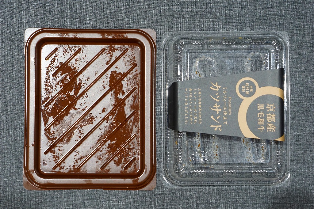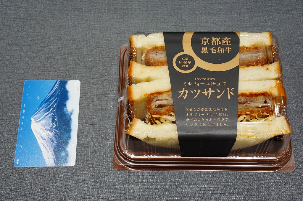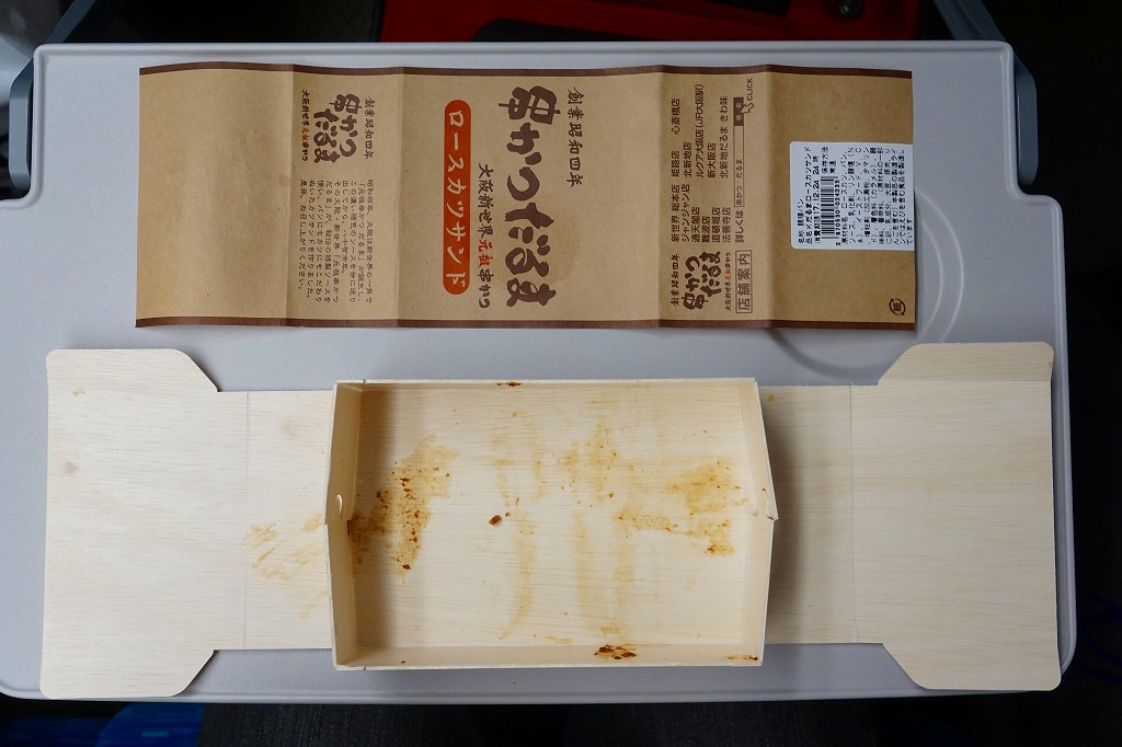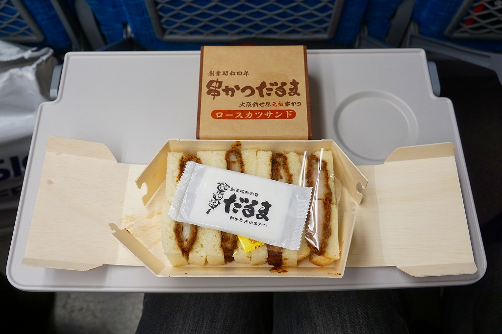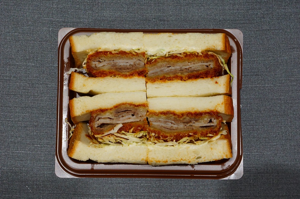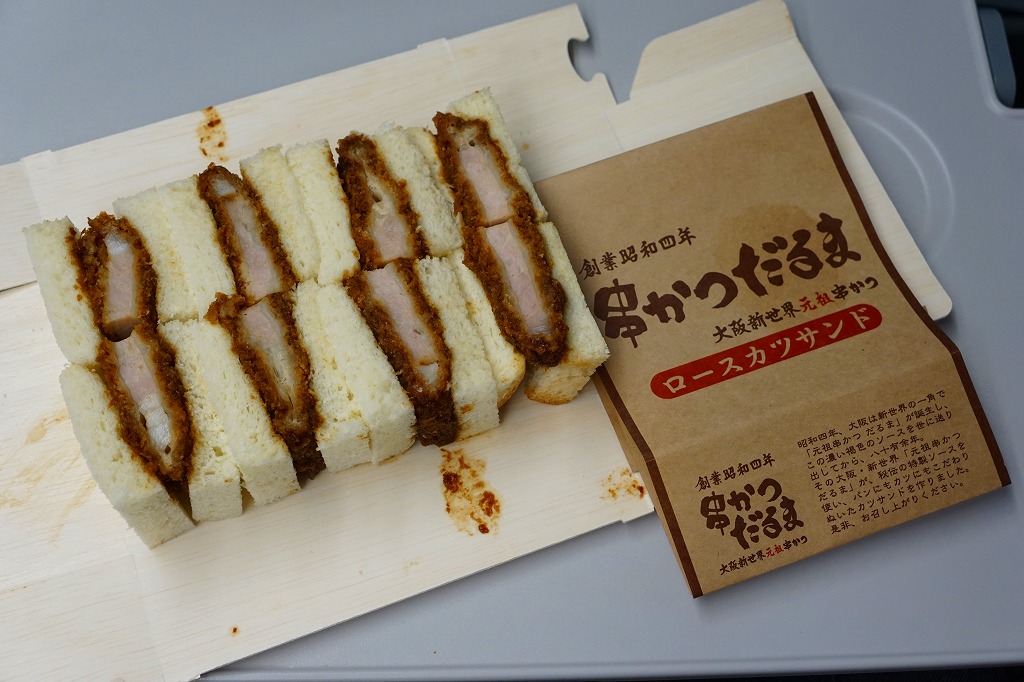 駅弁売店で売られていたカツサンド。商品そのものは大阪の駅弁ではなく、おそらく関西地方で手広く売られる惣菜であると思われる。デパ地下や空弁でよく見掛ける、中身を美しく見せる上げ底で透明なふたが盛り上がるプラ製容器に、牛肉の薄切りを重ねて揚げたソース漬けの牛カツを、キャベツの千切りとともに耳付きパンで挟むカツサンドが2切れ収まる。2切れのサンドイッチに、価格は四桁円。見た目に価格ほどの豪華さはないものの、正直にうまい爽やかな味。2017年までの販売か。