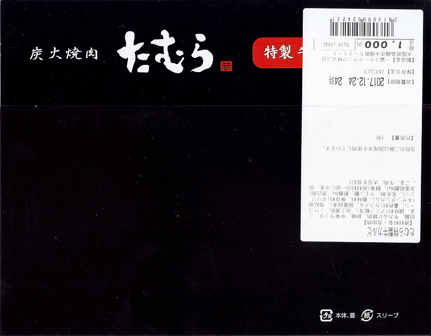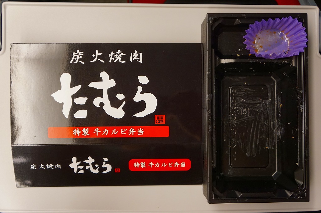 新幹線新大阪駅のコンビニで買えた弁当。2016(平成28)年11月の発売だそうな。炭火焼肉たむらとは、お笑い芸人のたむらけんじが運営する焼肉レストランチェーンで、2011(平成23)年9月から2016(平成28)年9月まで新幹線新大阪駅の改札内にも店舗があった。駅弁でもおなじみの容器も、店の名前を書いたボール紙のスリーブも真っ黒。中身は白御飯を牛カルビ焼肉で覆い、玉子焼と中華サラダを添える、よくある牛肉駅弁と同じタイプ。見た目では分からないが、薄めでパサつく感じの肉は味がなく、タレの風味でいただく感じ。味付けが濃いめに傾きがちな市販の弁当では珍しい、こんなアッサリした味の牛飯もよいかもしれない。価格は2017年の購入時で1,000円、2022年時点で1,080円、2025年時点で1,250円。