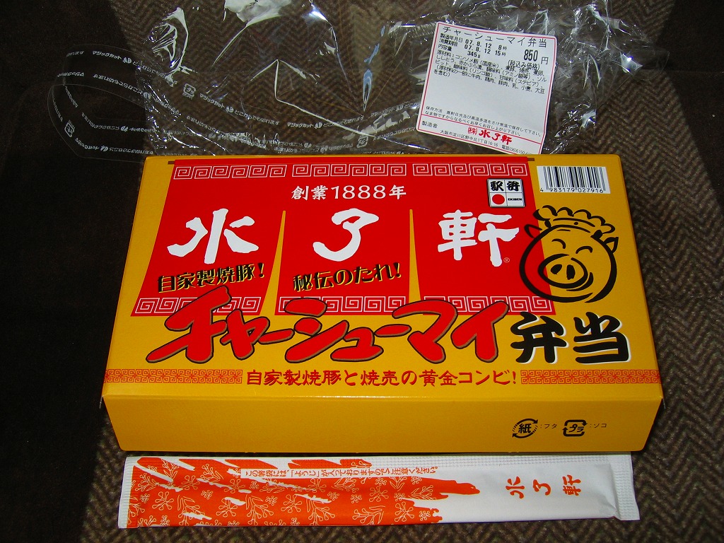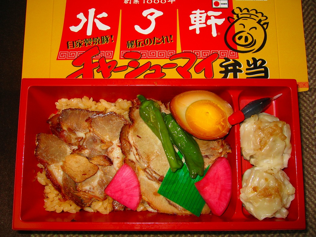 2007(平成19)年3月19日に「大阪特選ふぐづくし」とともに発売。11×20cmとやや小ぶりの長方形の容器に、駅弁の名前とのれんと駅弁屋名を書いたボール紙のふたをかける。中身は牛コンソメと豚コンソメで炊いた御飯を薄く敷き、その上にチャーシューを載せ、煮玉子とししとうと赤かぶら漬を添え、焼売2個を付けるもの。大きさと厚さがあるパラパラのチャーシューと、ややプリっとした焼売は、常温でも風味良好、駅弁に幅と賑わいをもたらし、出張客に人気を広めていた。