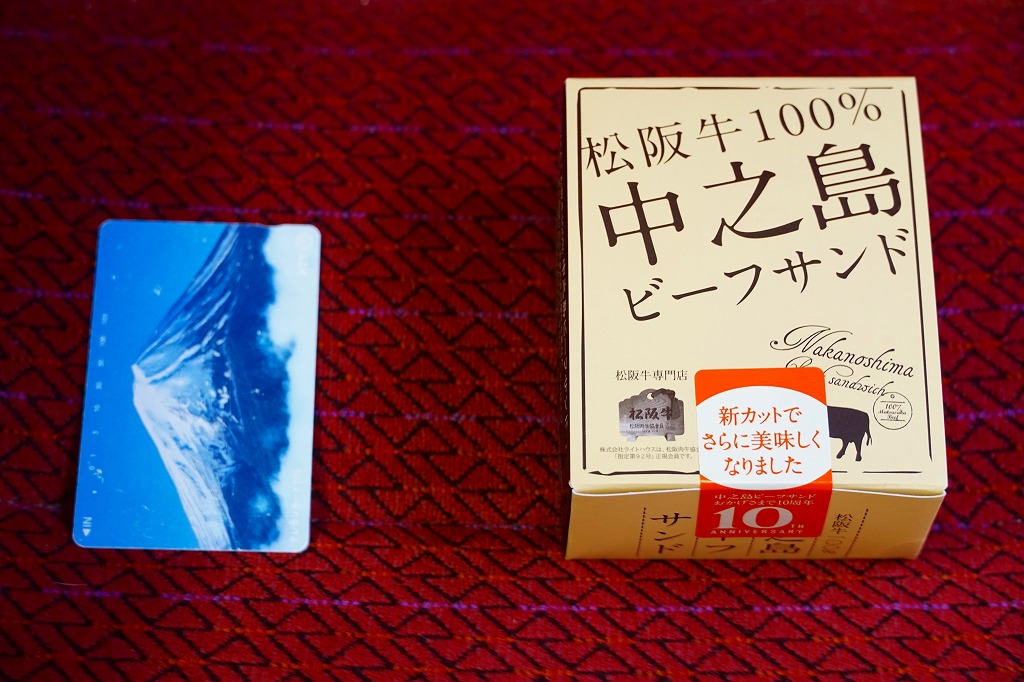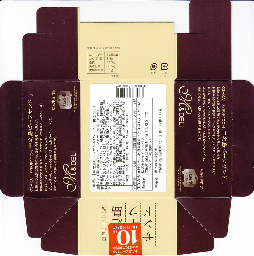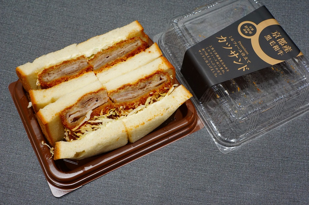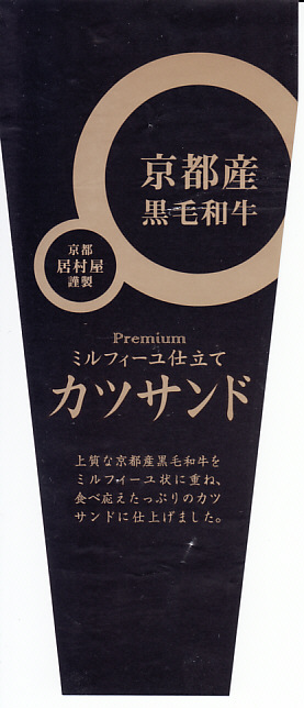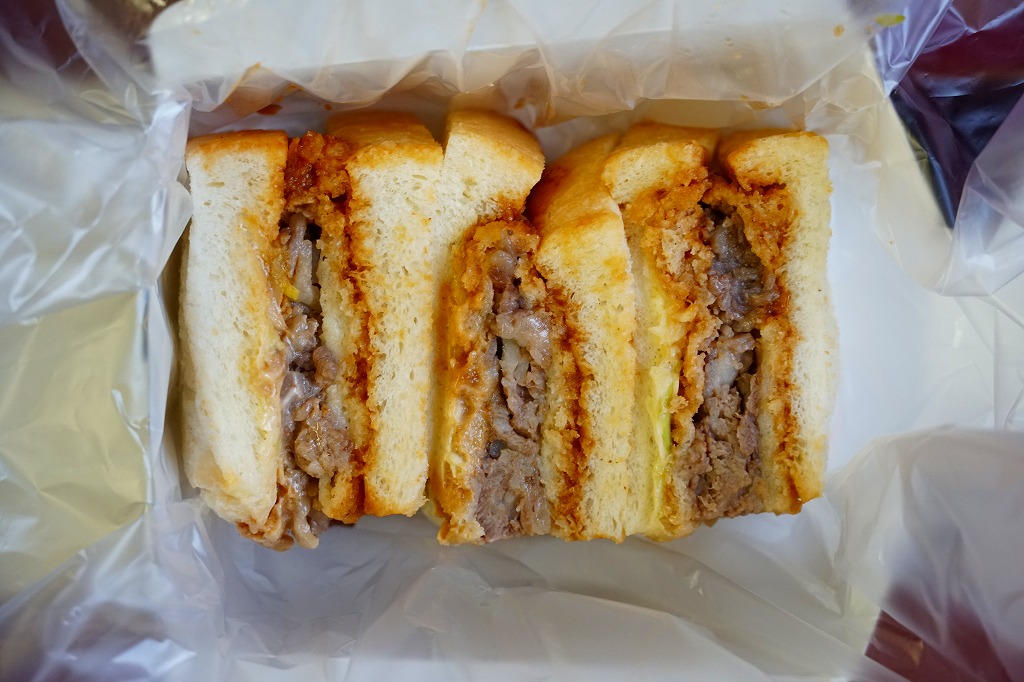 新大阪駅では2010(平成22)年4月に発売。大阪市中之島の仕出し牛肉弁当店が2009(平成21)年11月に売り出した、牛肉サンドイッチ。これは「ハーフ」で、松阪牛100%を名乗るビーフカツのソース漬けを、マヨネーズを塗った耳あり食パンのトーストに挟んだものが3切れ。すき焼きより細かくメンチより太い高級牛肉の風味を味わうというよりはむしろ、肉の脂肪分に揚げ物の油にマヨネーズと、強力な油まみれが口内や胃腸を襲う、遠慮のない肉サンド。もっぱらこの商品のみを売る売店は、2021年の訪問時には行列の人気だった。6切れ入りの「フルサイズ」は1,210円。製造は大阪駅弁の水了軒だった。価格は2021年の購入時で700円、2023年時点で720円、フルサイズは1,290円。2025年時点で「ハーフサイズ」が800円で「レギュラーサイズ」が1,450円。