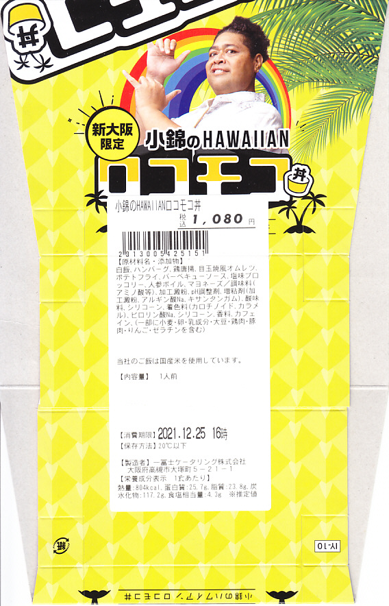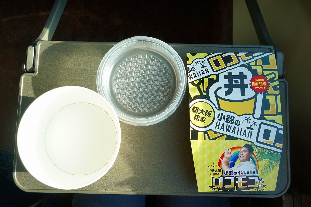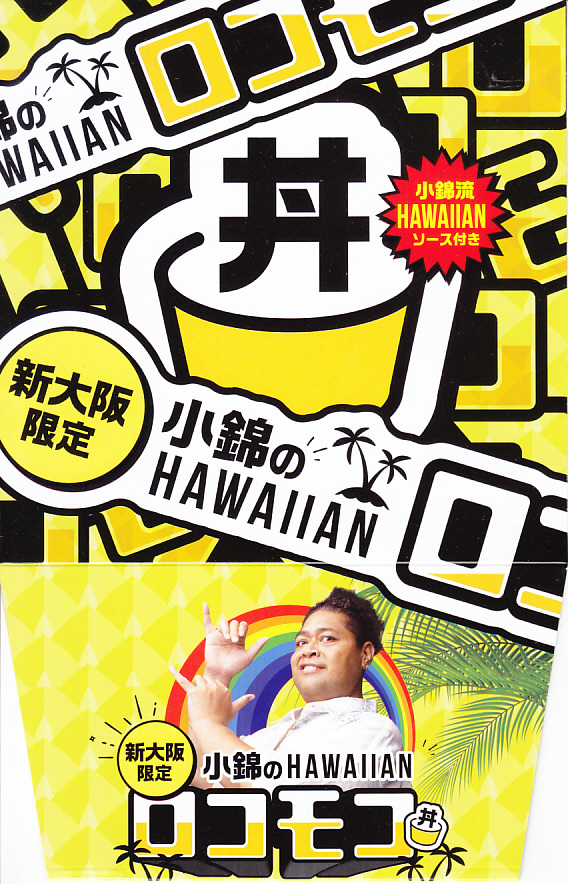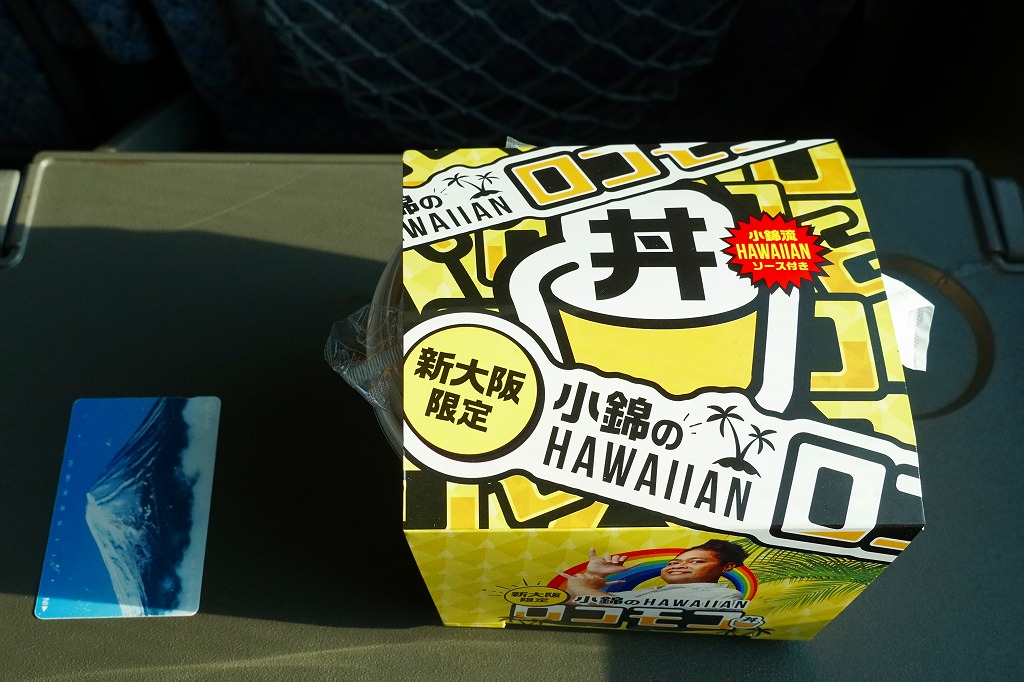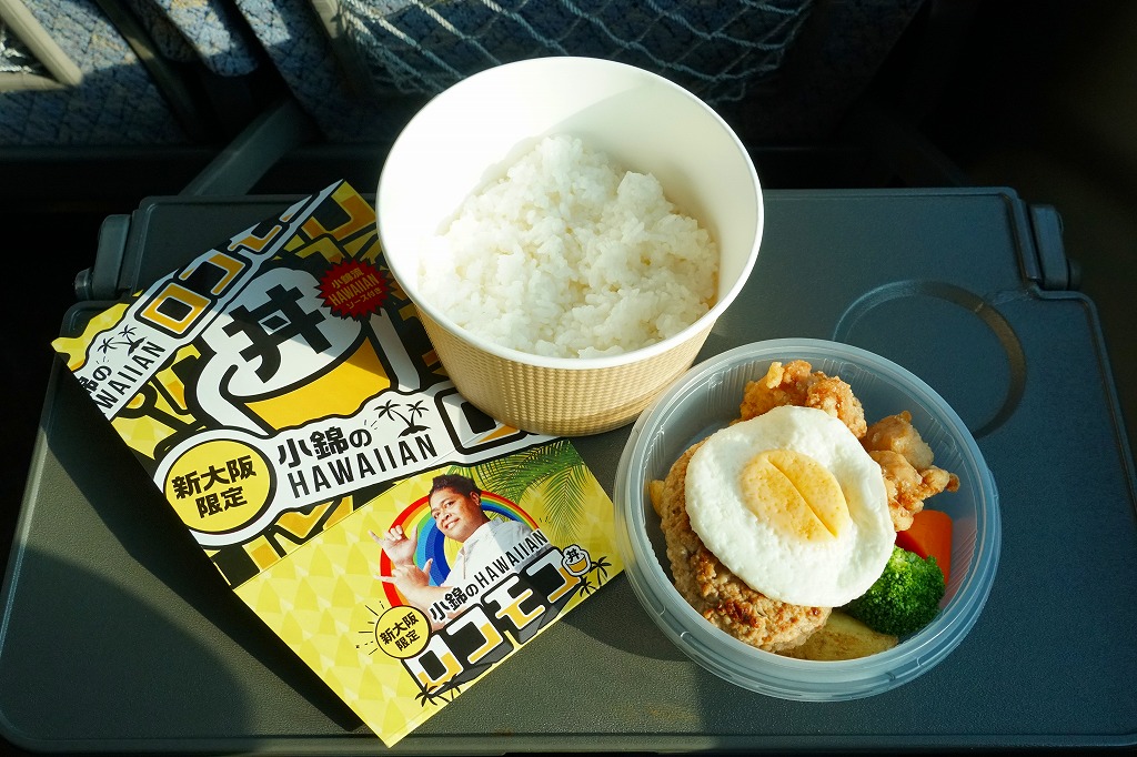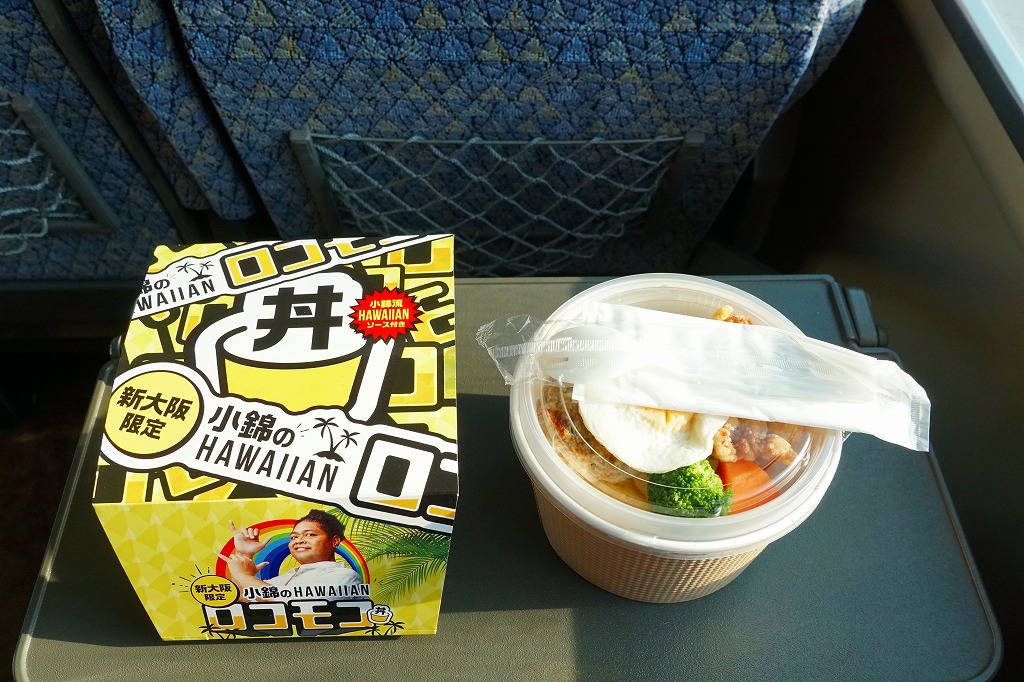 2021(令和3)年12月25日に新幹線新大阪駅の土産物店「グランドキヨスク新大阪」で発売。アメリカ・ハワイ出身の元大相撲力士でタレントの、「小錦さんのハワイアンBBQソースを使用したロコモコ丼」なのだそうな。大きな紙カップに白飯を詰め、ハンバーグ、目玉焼き、鶏唐揚、にんじん、ブロッコリー、フライドポテトを詰め半透明のトレーで覆い、商品名やタレント写真でデザインしたスリーブにはめて、バーベキューソースとマヨネーズの袋を貼り付ける。見た目どおり、内容どおりのロコモコ丼、ハンバーグ丼。駅で買って列車で食べる場合、この内容を冷蔵の状態でいただくことになる。1か月間ほどの販売か。