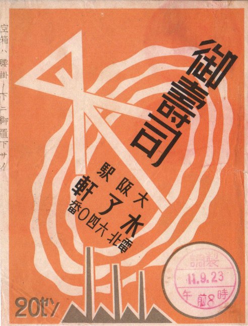 1936(昭和11)年9月23日8時、あるいは1922(大正11)年の調製と思われる、昔の大阪駅弁の掛紙。大阪の市章である澪標(みおつくし)と工場でデザインされた。