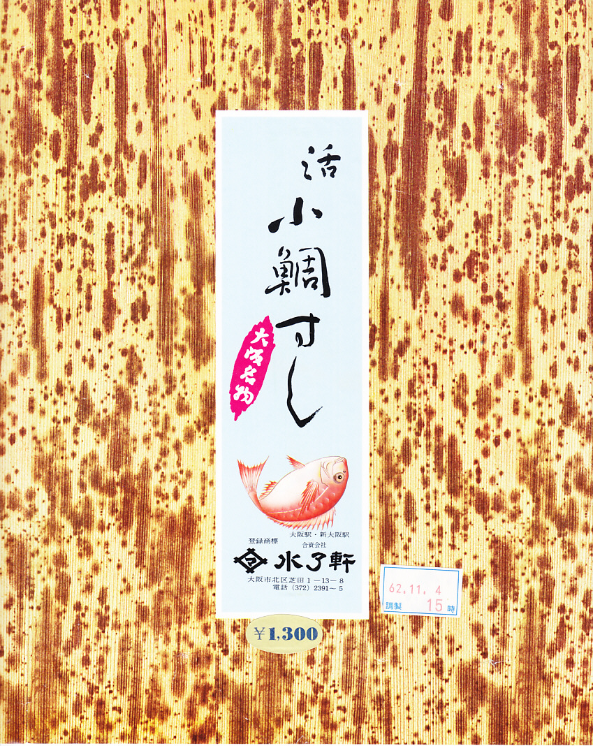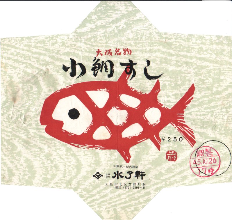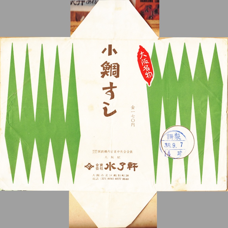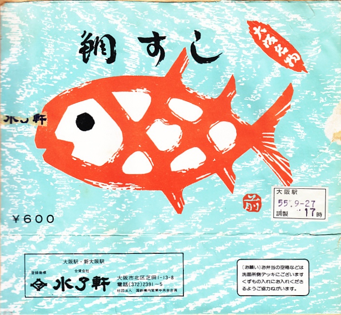 1980(昭和55)年9月27日17時の調製と思われる、昔の大阪駅弁の紙箱の一部。その絵柄は、下記の10年前の小鯛すしと同じ。