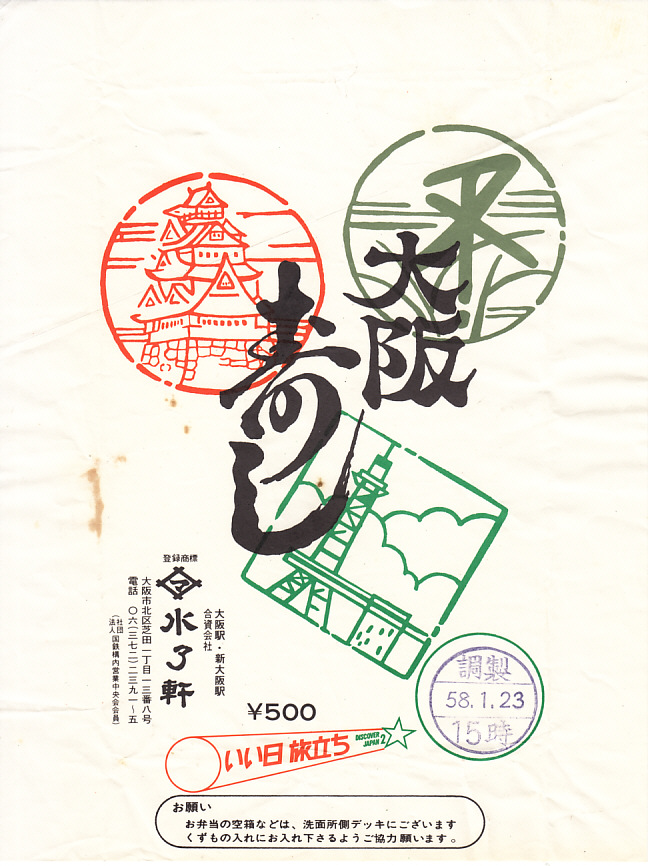 1983(昭和58)年1月23日15時の調製と思われる、昔の大阪駅弁の掛紙。大阪市章、大阪城、通天閣の絵柄が、スタンプのように描かれる。中身は巻き寿司4個に伊達巻き1個、アナゴや白身魚の押し寿司4個ということで、上記の2007年のものとほぼ同じだった模様。
