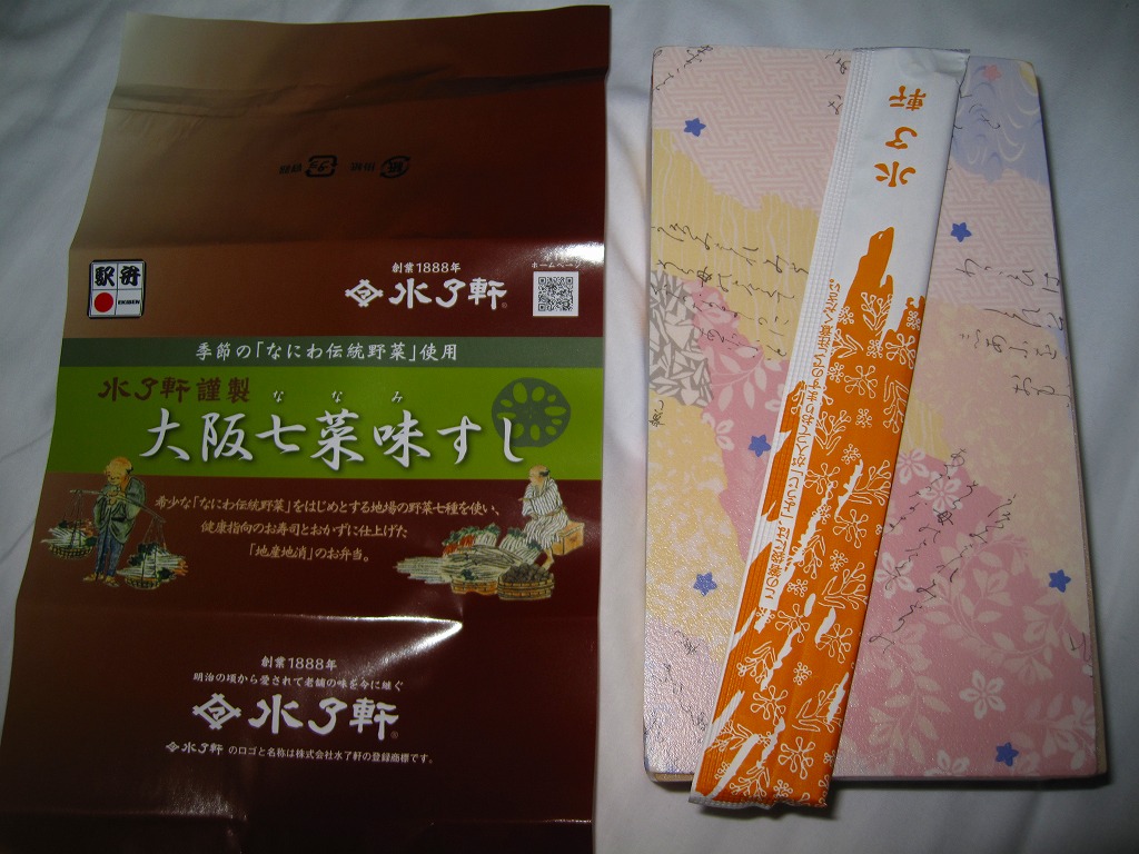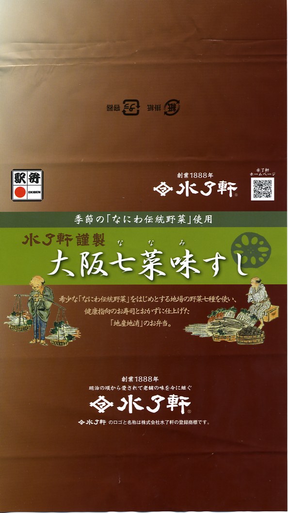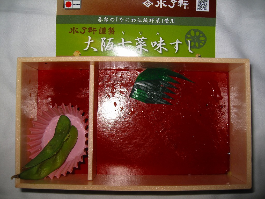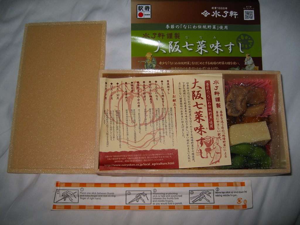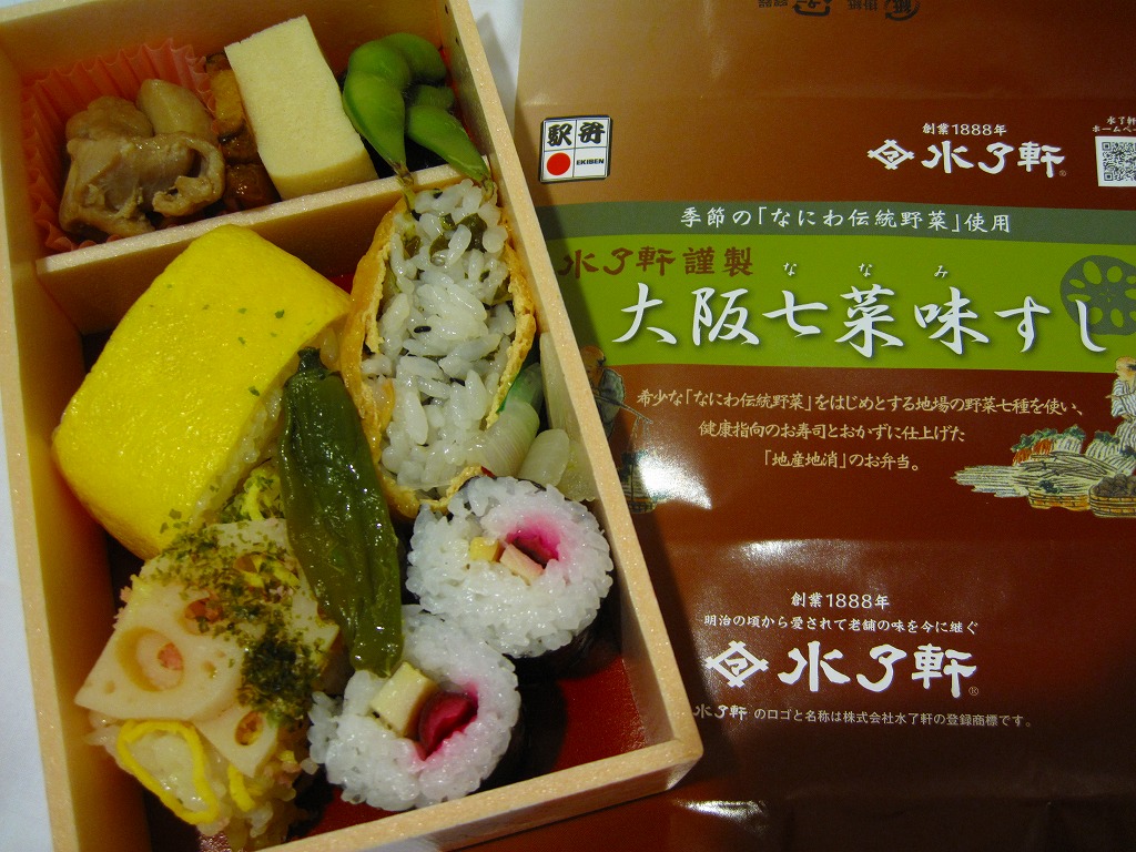 大阪駅で伝統の駅弁。経木枠の箱の中に太巻き4切れと伊達巻1切れ、それにアナゴ、エビ、タイ、鮭、昆布の箱寿司がそれぞれ1切れずつ入る。関西の伝統的な食文化の一端を詰めて、地味に地道に郷土の味を伝える、駅弁の鑑。この内容で売られ続けることを願いたい。単に食事としても機能的だし、常温で普通にうまい。