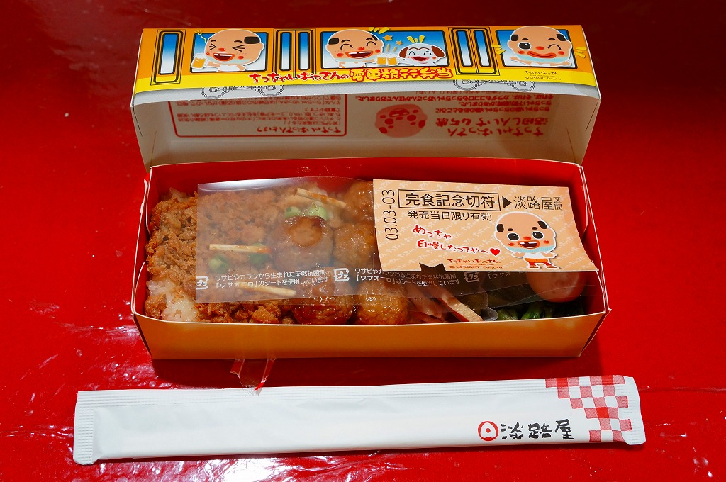 これは駅弁でなく、明石海峡大橋の淡路島側に位置する淡路サービスエリアで販売されていた土産物。小骨が浮き出るワイルドで薄く身の締まった焼きアナゴの棒寿司が1本、ビニール袋に密封されて市販の白い紙箱に収まり、商品名とブランド名を書いた掛紙が巻かれる。少量の割に高価であるが、味付けと食感が硬すぎず柔らか過ぎず、同じ調製元の焼サバ寿司とは雲泥の差。アナゴがいてサバはいない瀬戸内海沿岸では、買う前から選択の方向が見えていたかもしれない。