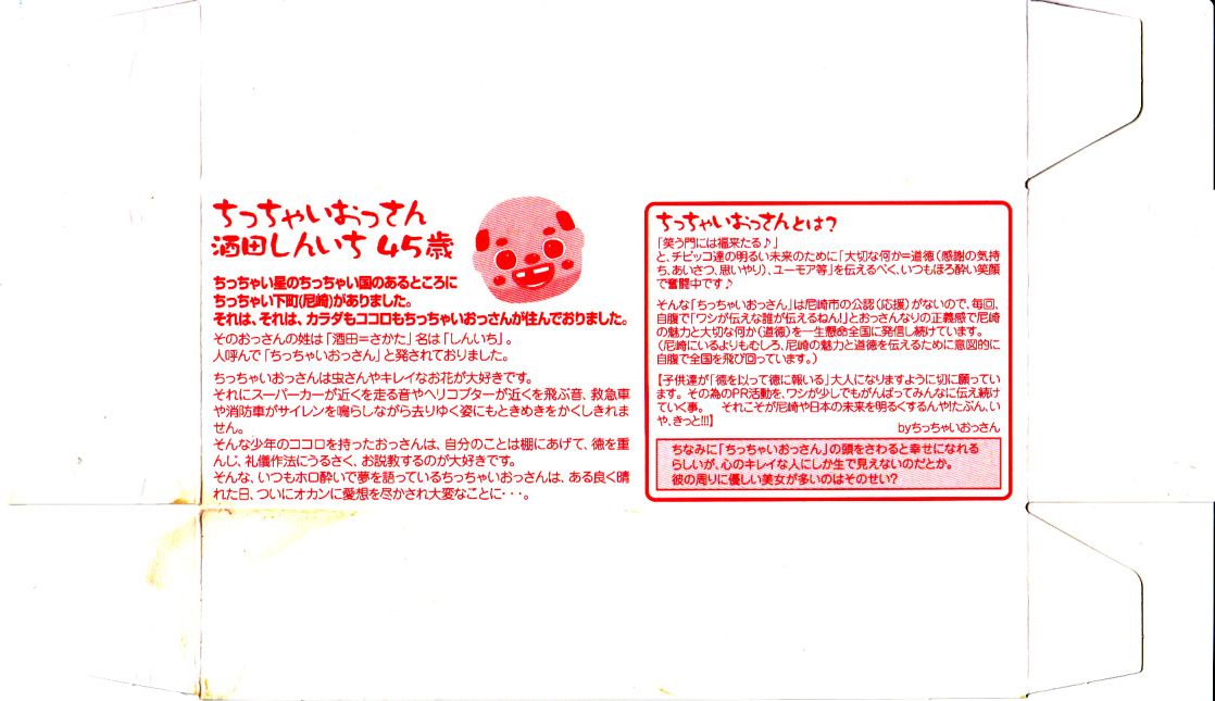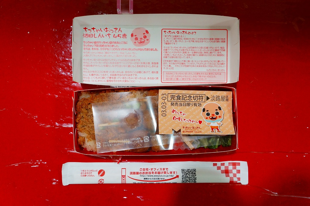 2014(平成26)年1月の阪神百貨店の駅弁大会で、尼崎駅の駅弁として販売。実際に尼崎駅で売られたかは疑義がある。東京都新宿のキャラクター会社が持つコンテンツ「ちっちゃいおっさん」を名乗り、その絵柄がパッケージの表や裏や横や中に使われる。中身は醤油飯を鶏つくね串と鶏そぼろで覆い、焼き鳥、小松菜、クルミ、ししとう、ニンジン、うずらの卵を添える。小腹あるいは酒の友に良さそうな、味の濃い軽食の味は悪くない。4月頃まで新大阪駅か大阪駅で売られた模様。