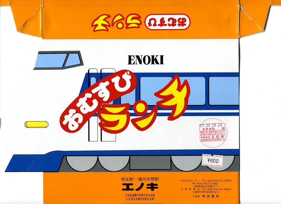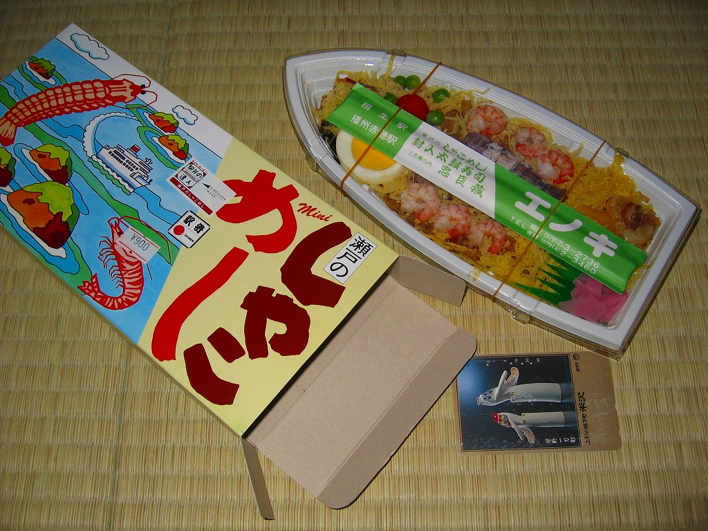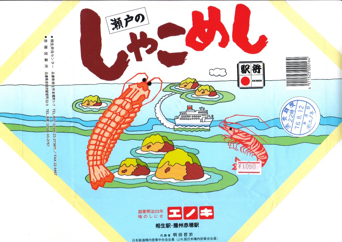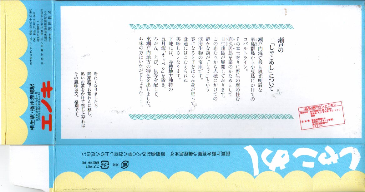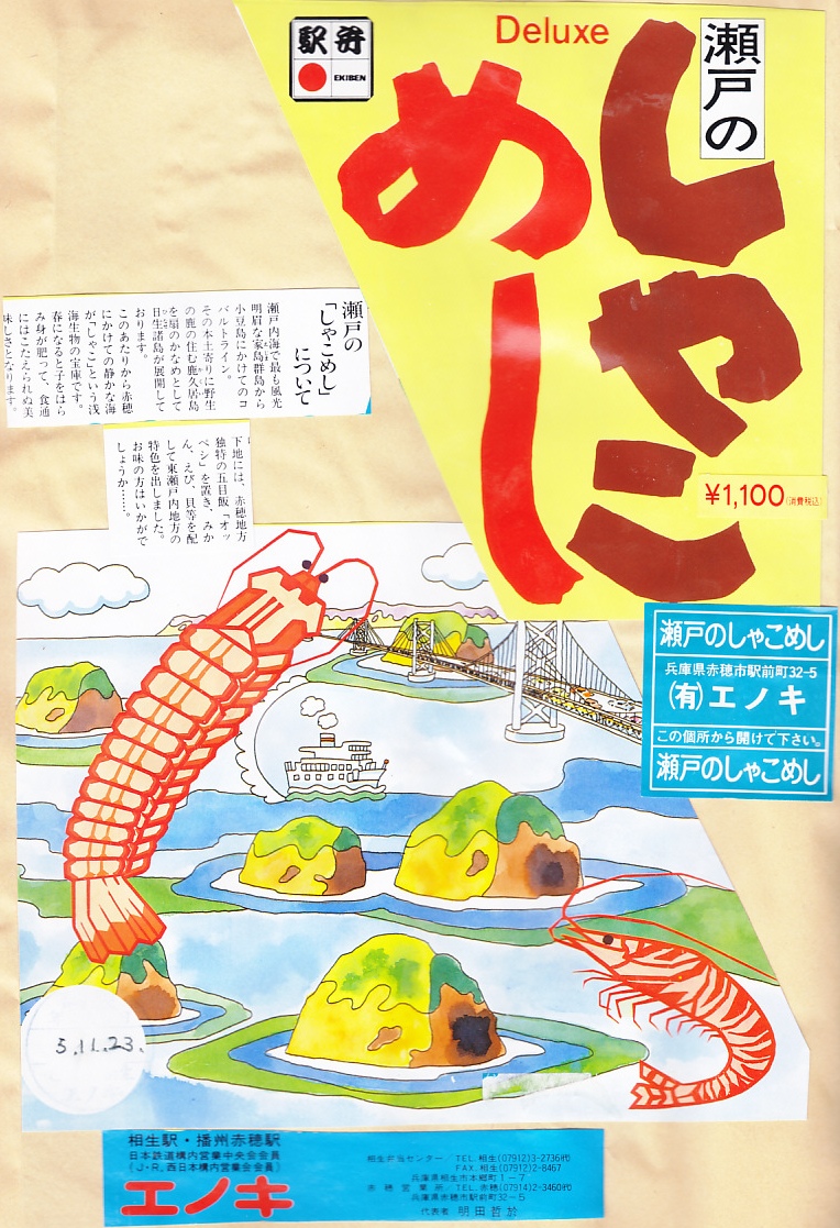 入手状況から1993(平成5)年11月23日の調製と思われる、昔の相生駅弁のパッケージの一部。上記の2004年に購入した「瀬戸のしゃこめし(小)」と、同じような箱だったと想像する。