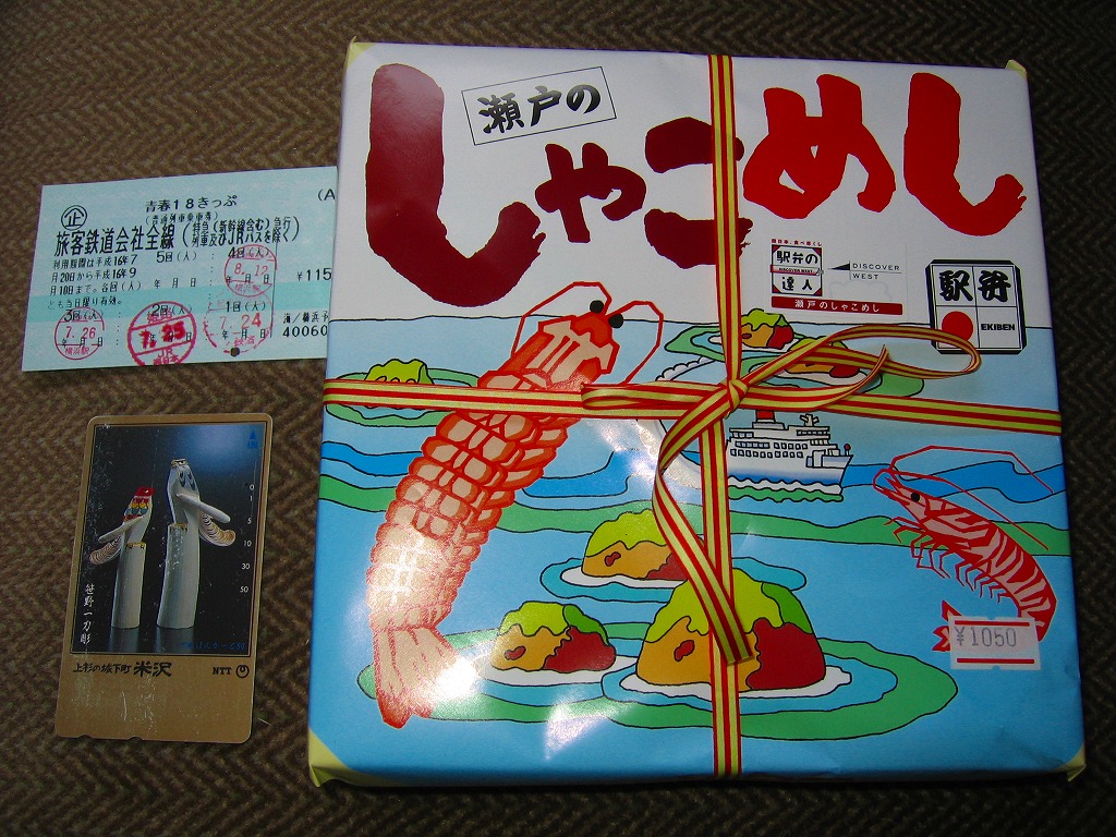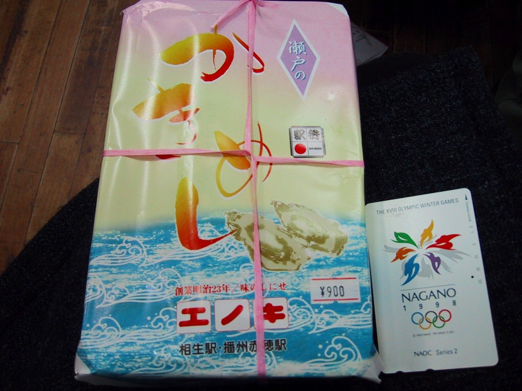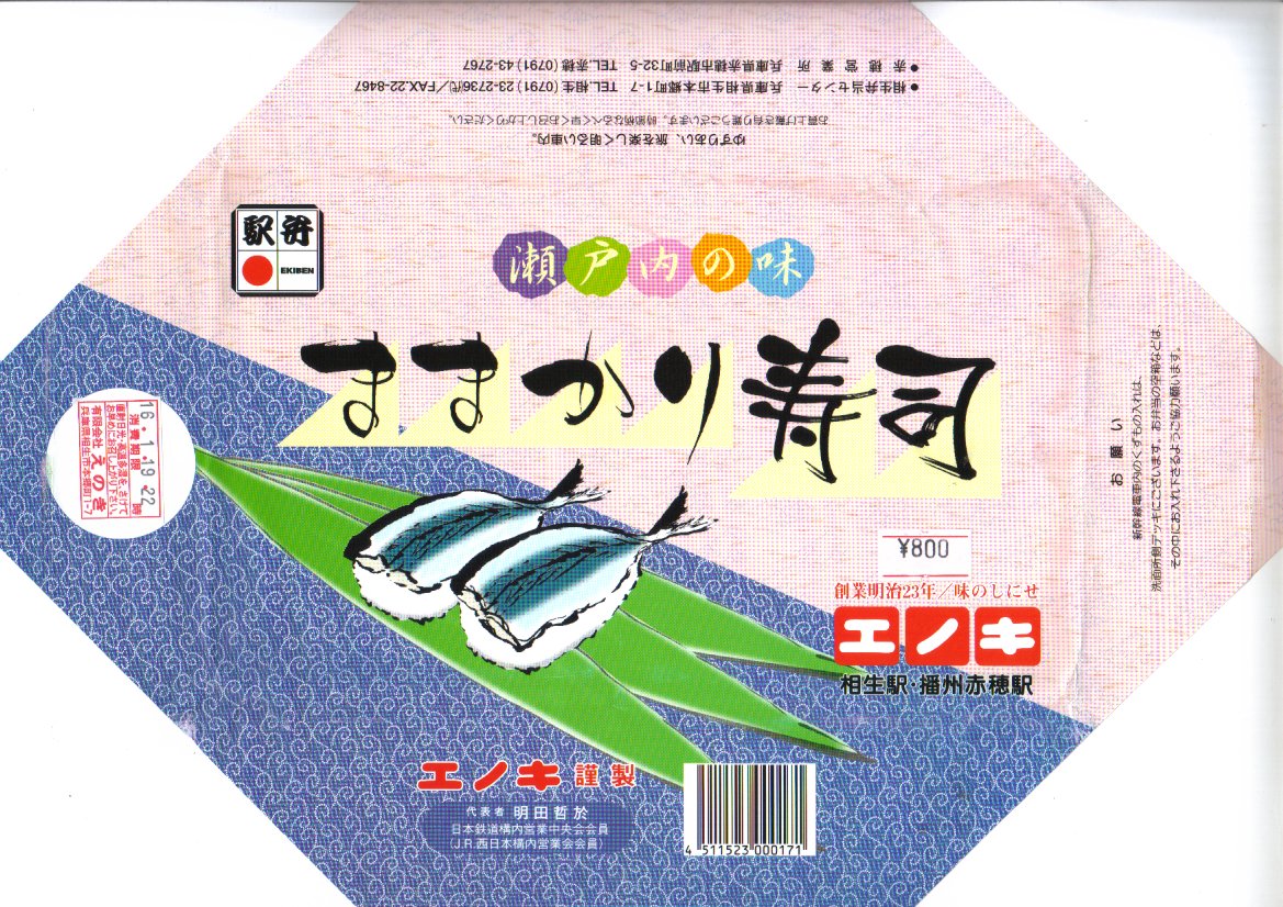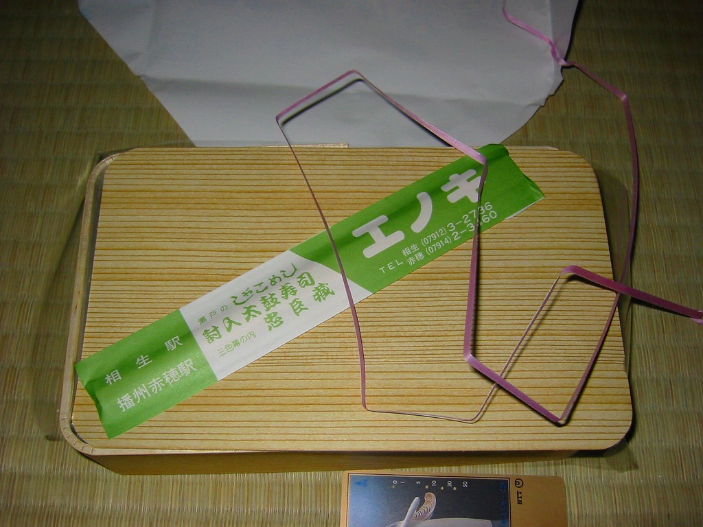 入手状況から1993(平成5)年11月23日の調製と思われる、昔の相生駅弁のパッケージの一部。上記の2004年に購入した「瀬戸のしゃこめし(小)」と、同じような箱だったと想像する。