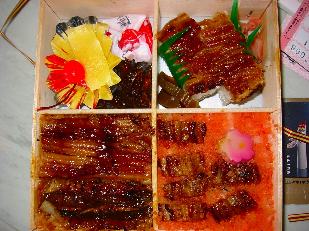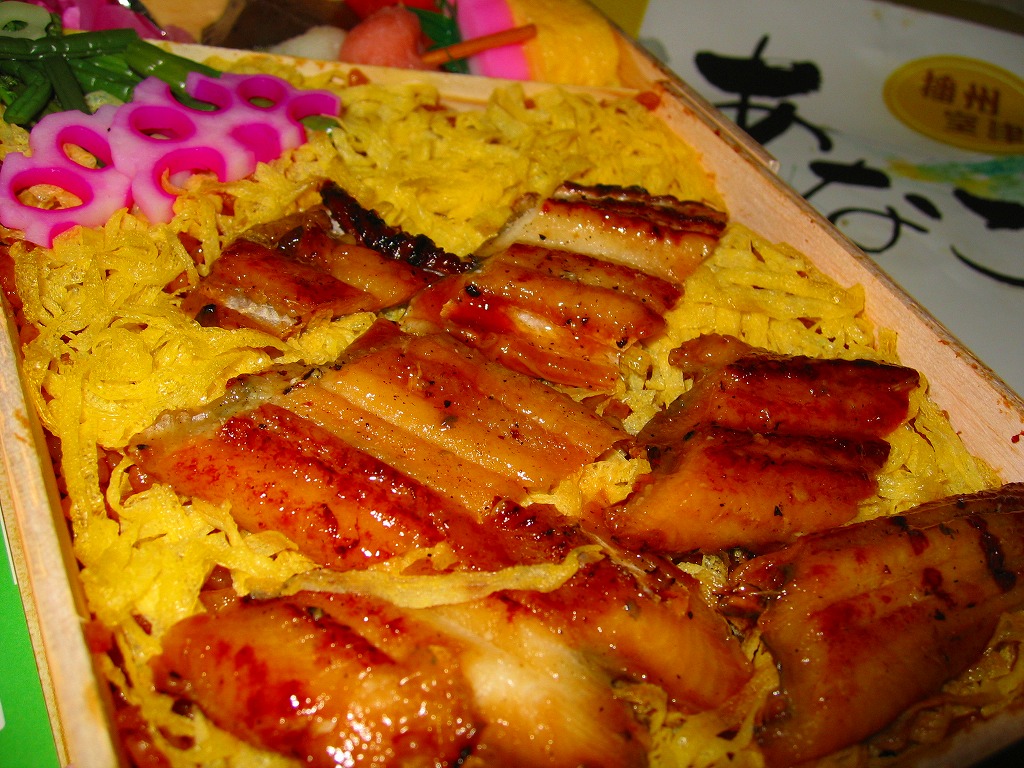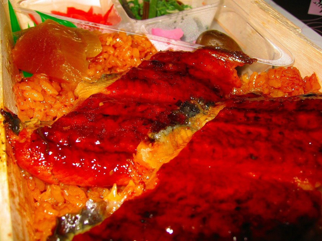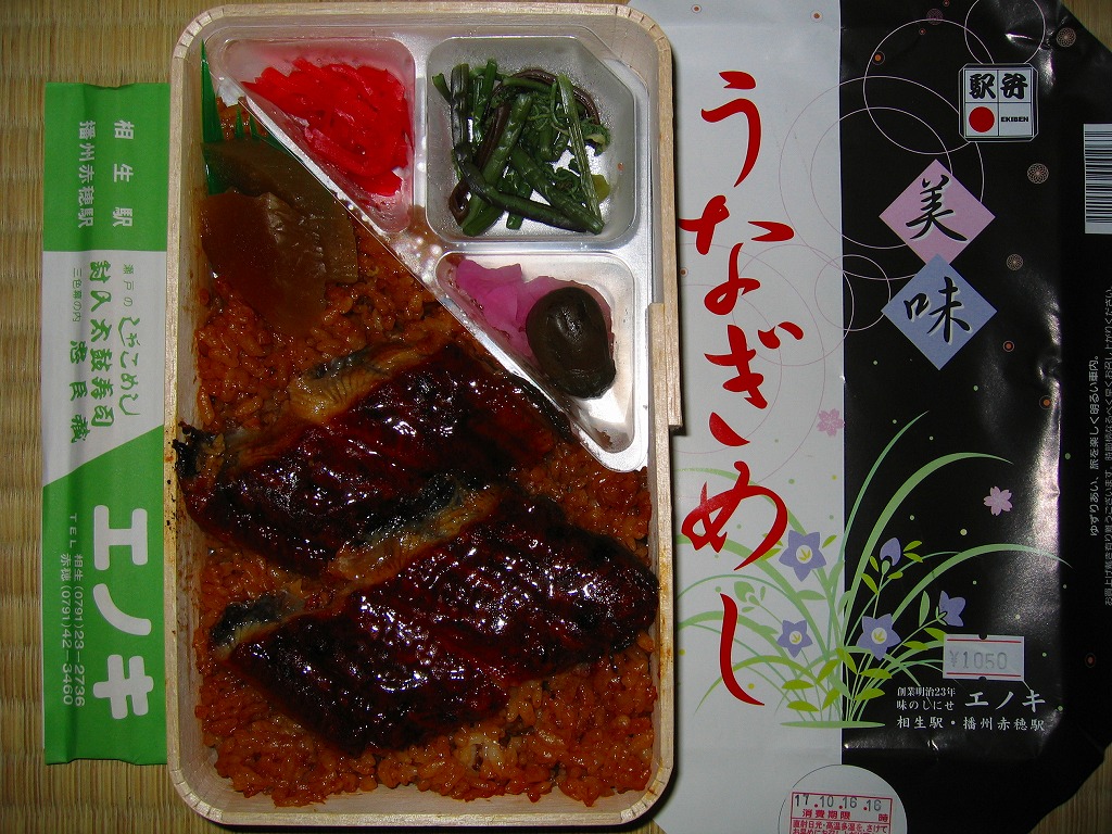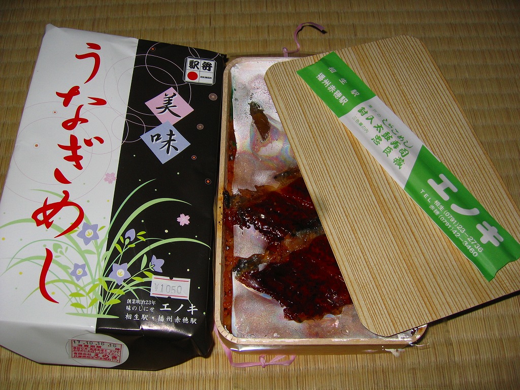 経木枠の長方形の容器に木目調の紙ぶたをかけて、うなぎと何ら関係のなさそうなデザインの掛紙で包み、紙ひもでしばる。中身は駅弁の名前そのままの、うなぎめし。鰻の品質は並だったが、蒲焼と御飯に浸みるタレの風味は、掛紙での文句どおり美味だと思った。