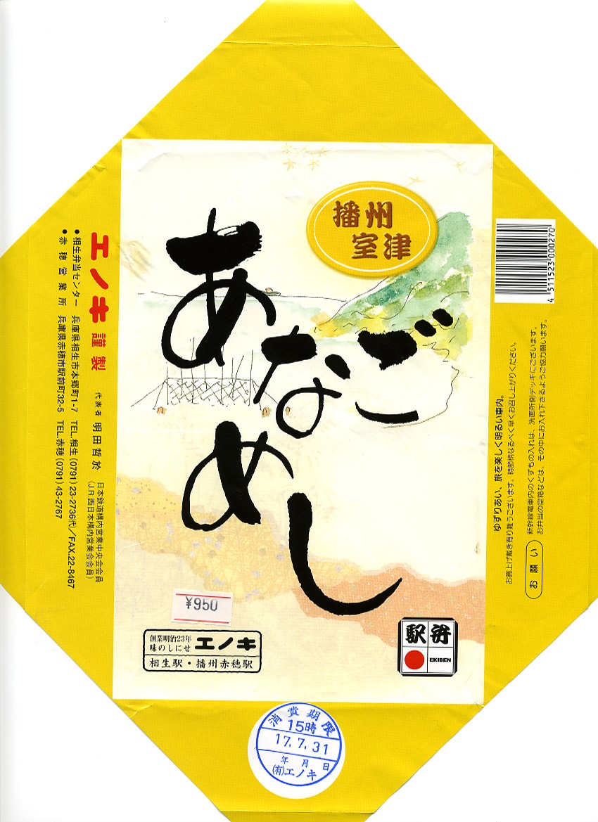 内部を十字に仕切った田の字型の正方形経木枠の容器を使用、木目のボール紙でふたをして、広重「山海見立相撲・室津図」風に室津の港を描いた掛紙をかけて紙ひもでしばる。中身は穴子飯、穴子鮨、穴子ちらしと穴子づくしで、デザートとしてフルーツと地元の銘菓を添える。