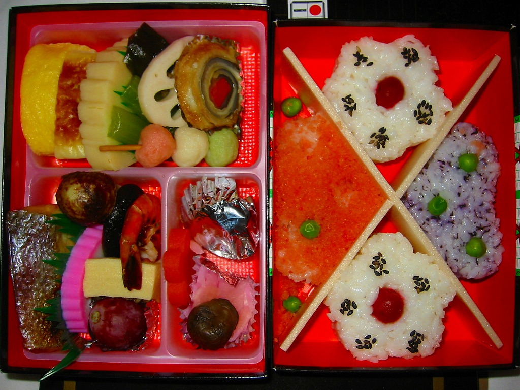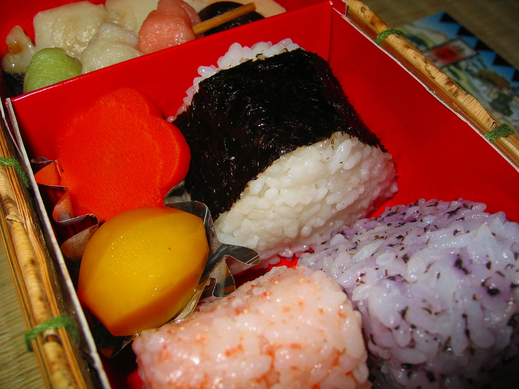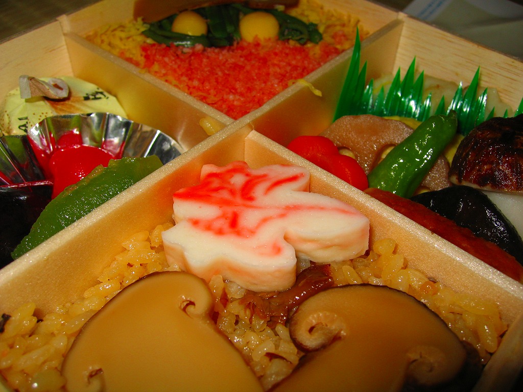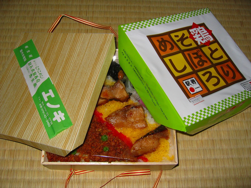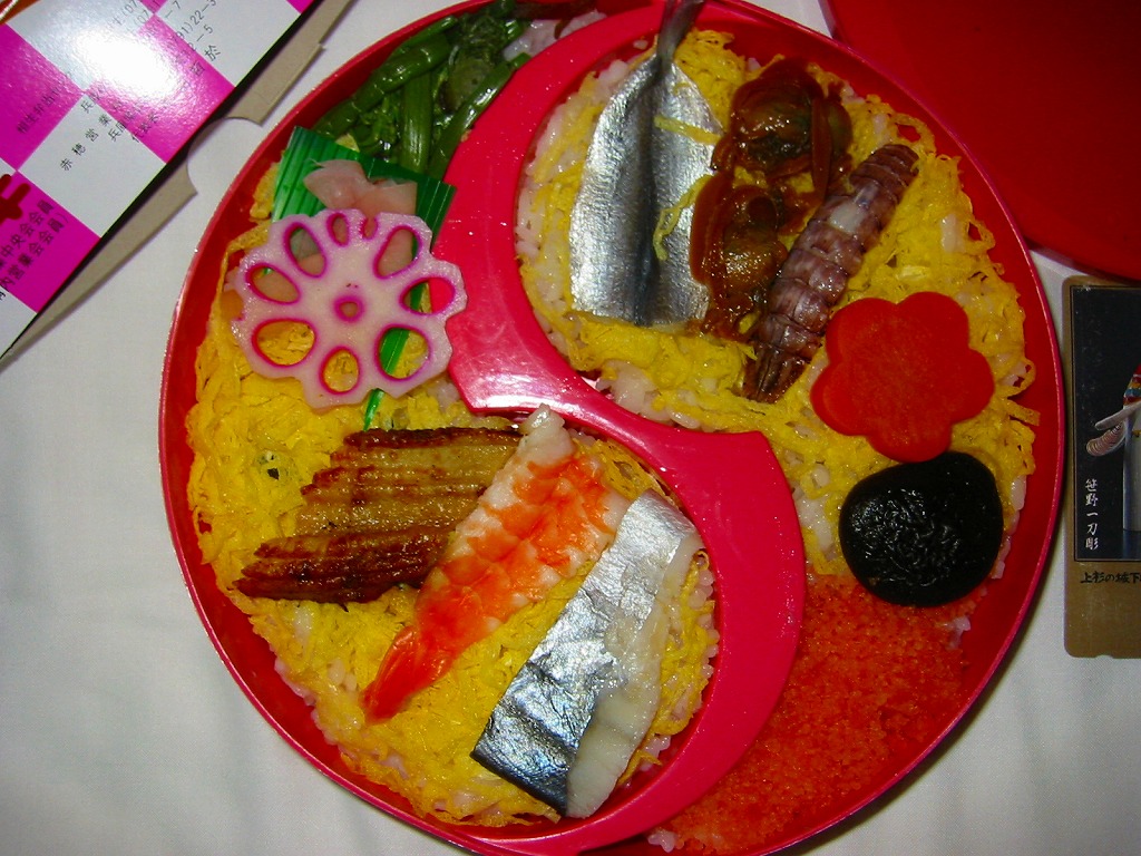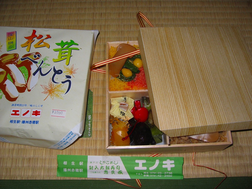 2001(平成13)年に発売か。黒いボール紙で組み立てた駕篭型の二段重ね容器を使用、中身は下段に梅花型日の丸御飯がふたつと松型のゆかり御飯に酢飯、上段は帆立、穴子巻、焼鮭、蒲鉾、松茸小芋など19種のおかず。盛り付けが整っており、もちろん味も良い。