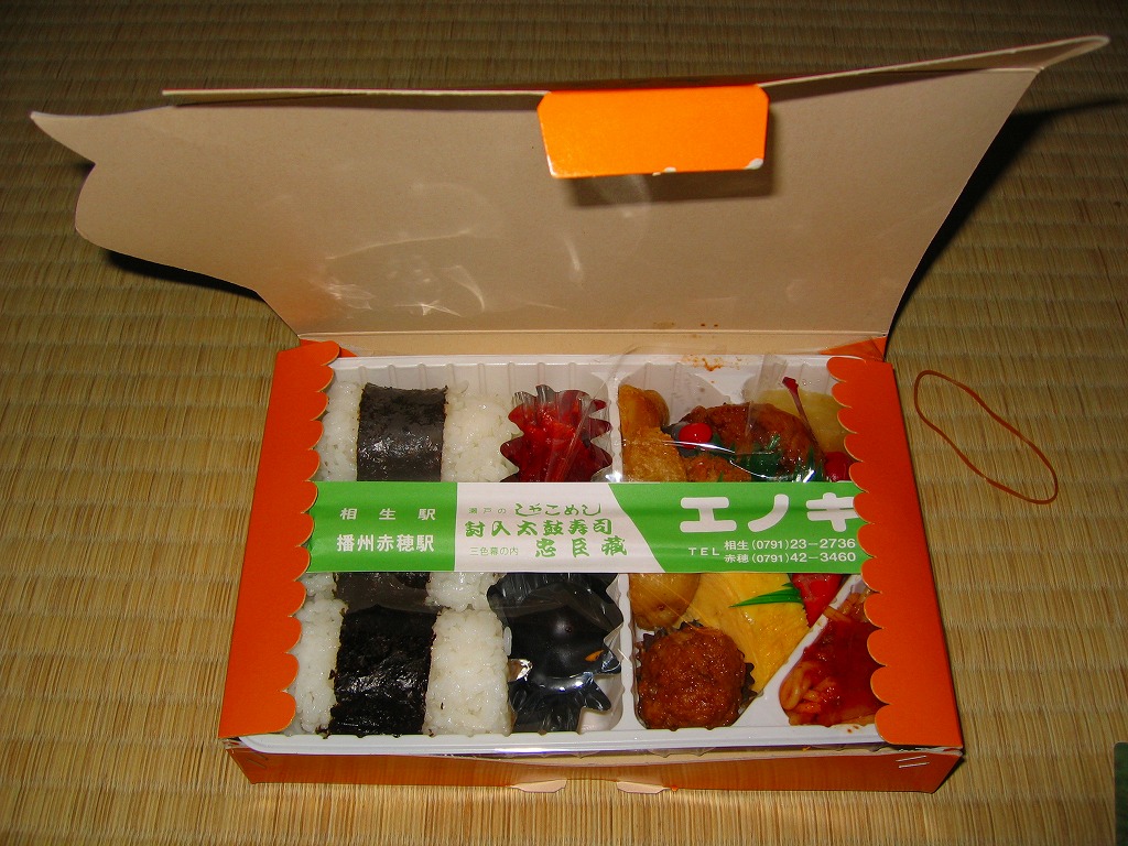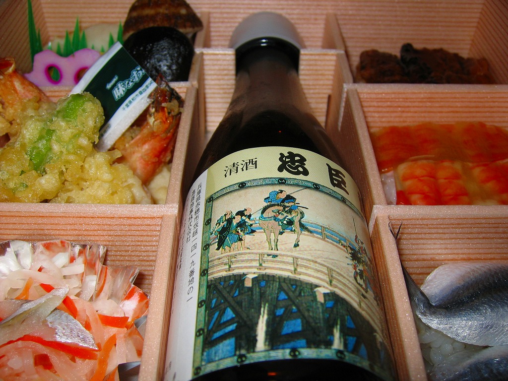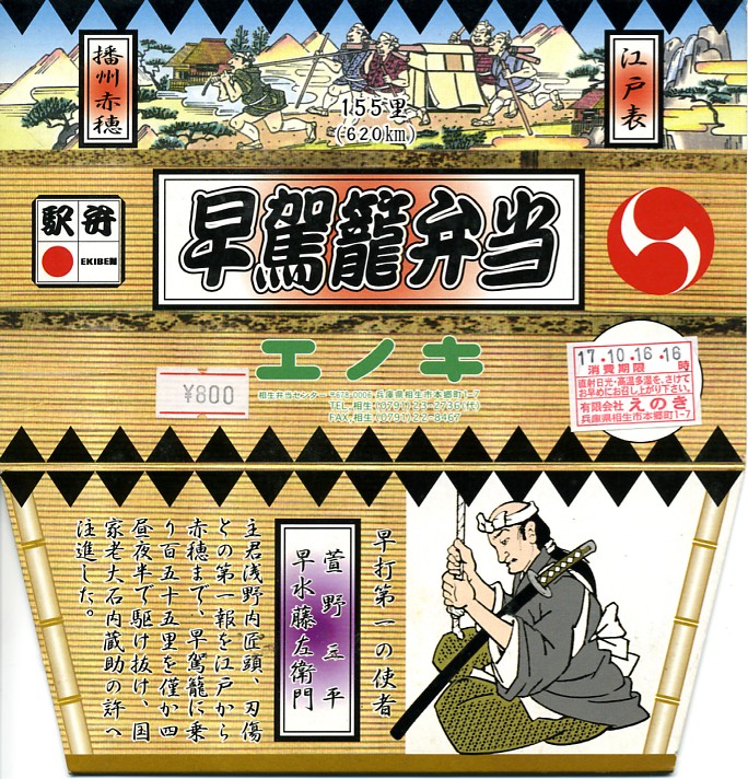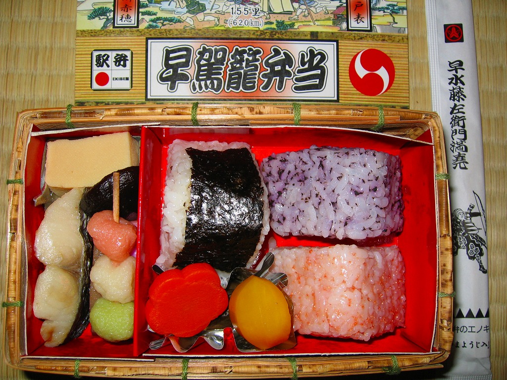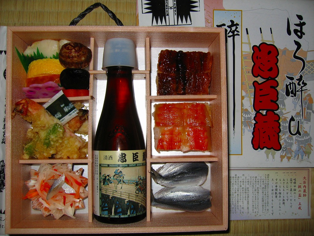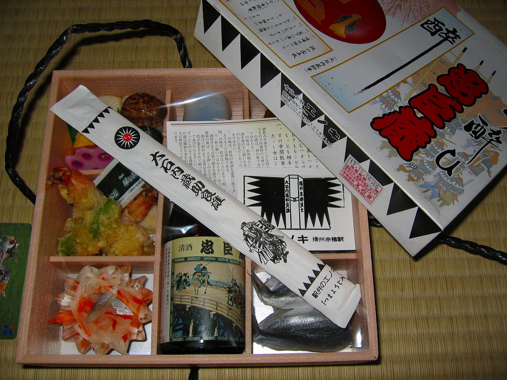 日本で何番目かの酒入り駅弁。それほど大きくないほぼ正方形の容器に、忠臣蔵を文字や背景で描いたボール紙のフタをして、ビニールひもでしばる。中身は穴子と海老とたぶんママカリの寿司、大根の酢の物、海老やシシトウなどの天ぷら、焼き魚・蒲鉾・玉子焼・煮物。中央にデンと座る清酒「忠臣蔵」を呑むための内容だろう。要予約。