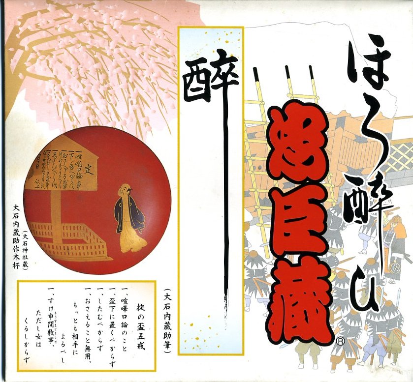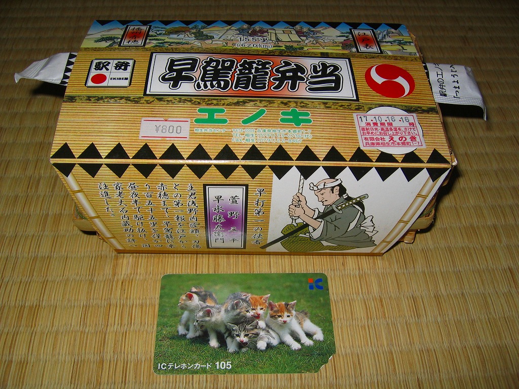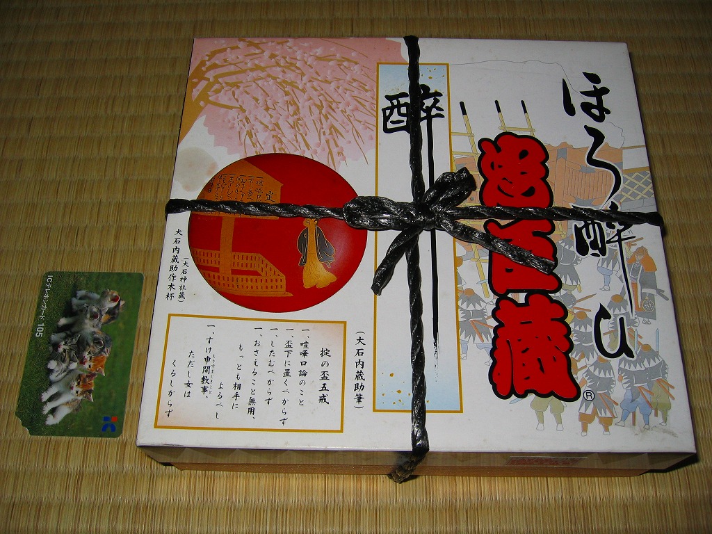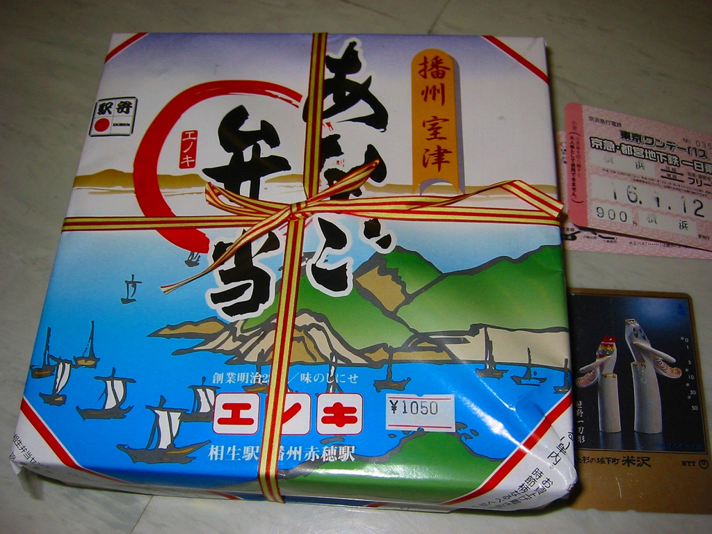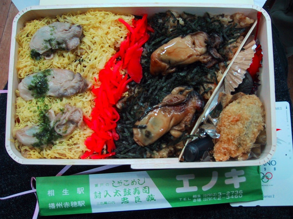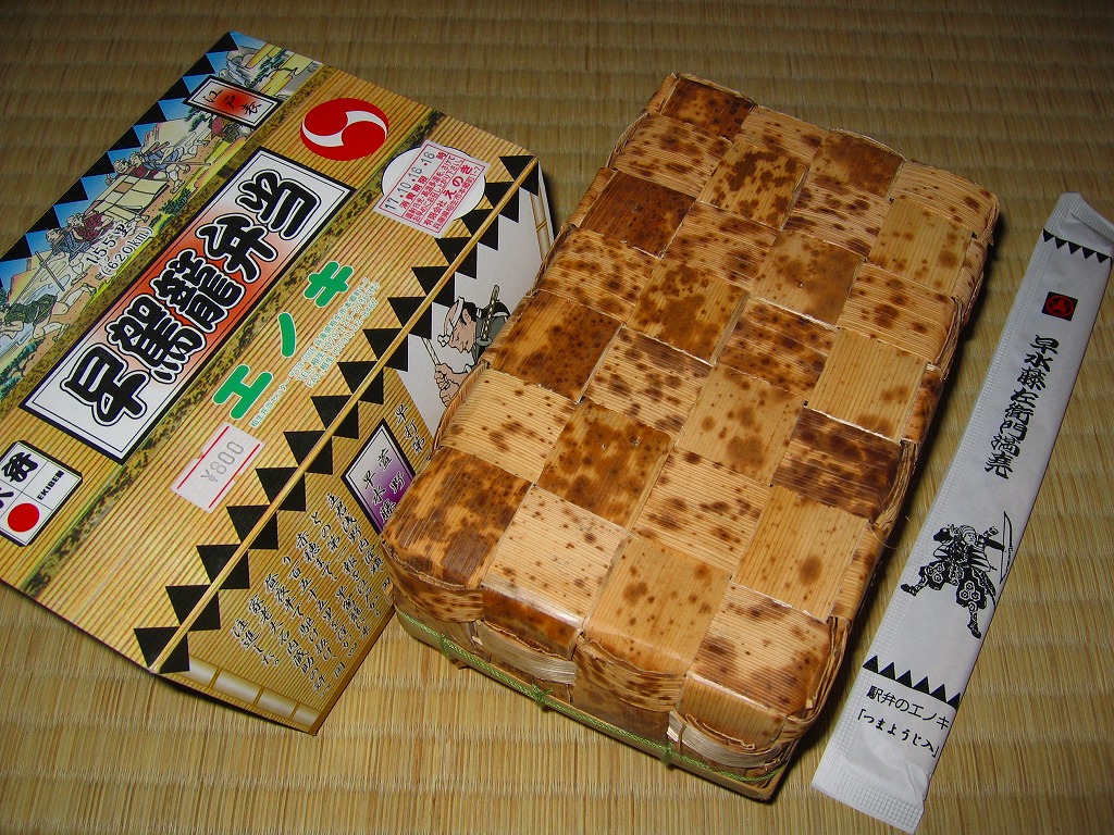 日本で何番目かの酒入り駅弁。それほど大きくないほぼ正方形の容器に、忠臣蔵を文字や背景で描いたボール紙のフタをして、ビニールひもでしばる。中身は穴子と海老とたぶんママカリの寿司、大根の酢の物、海老やシシトウなどの天ぷら、焼き魚・蒲鉾・玉子焼・煮物。中央にデンと座る清酒「忠臣蔵」を呑むための内容だろう。要予約。