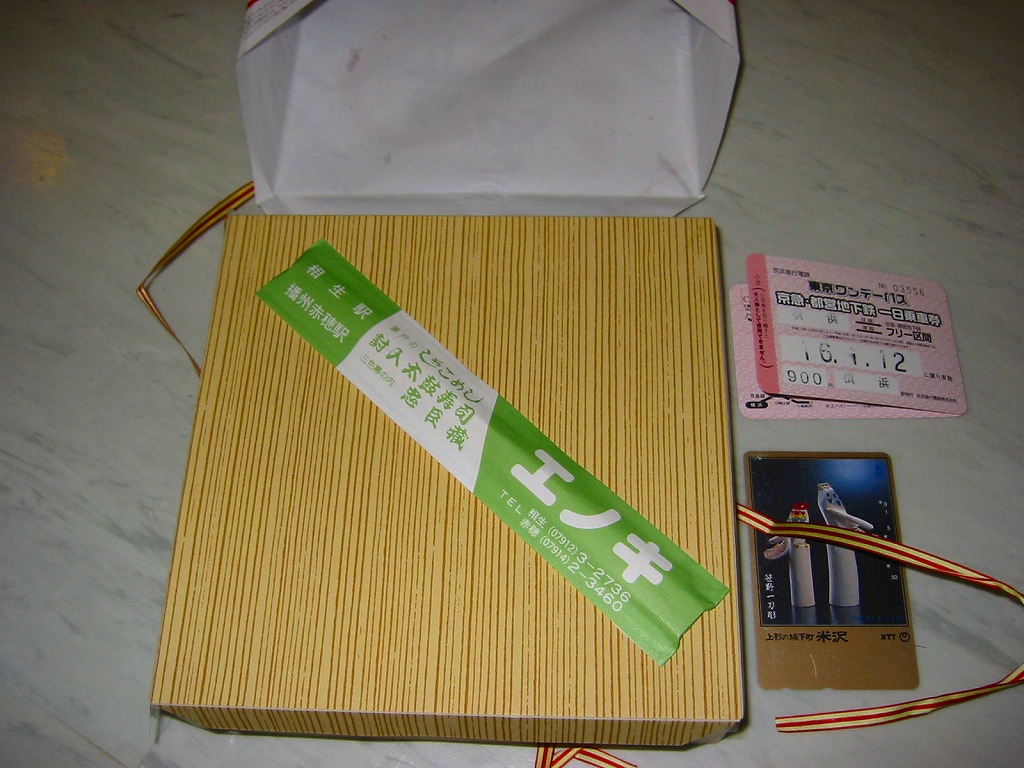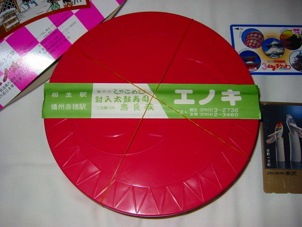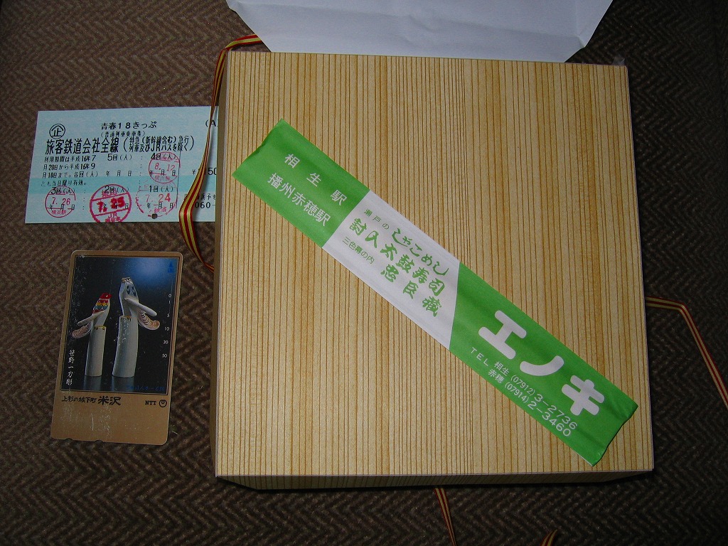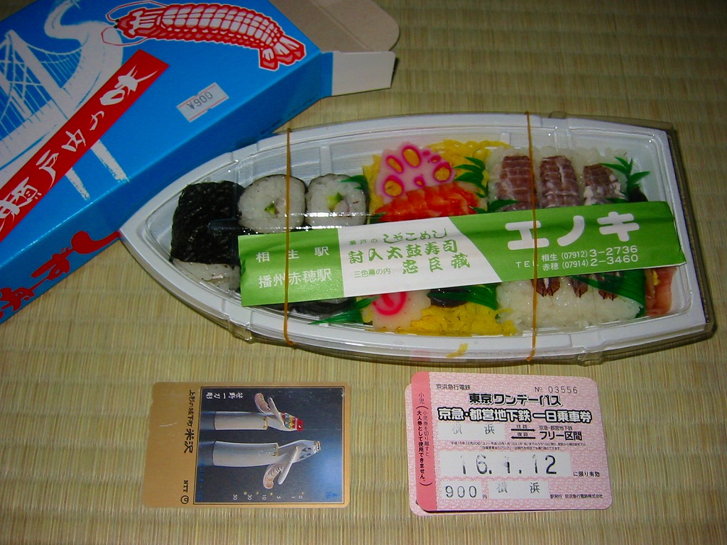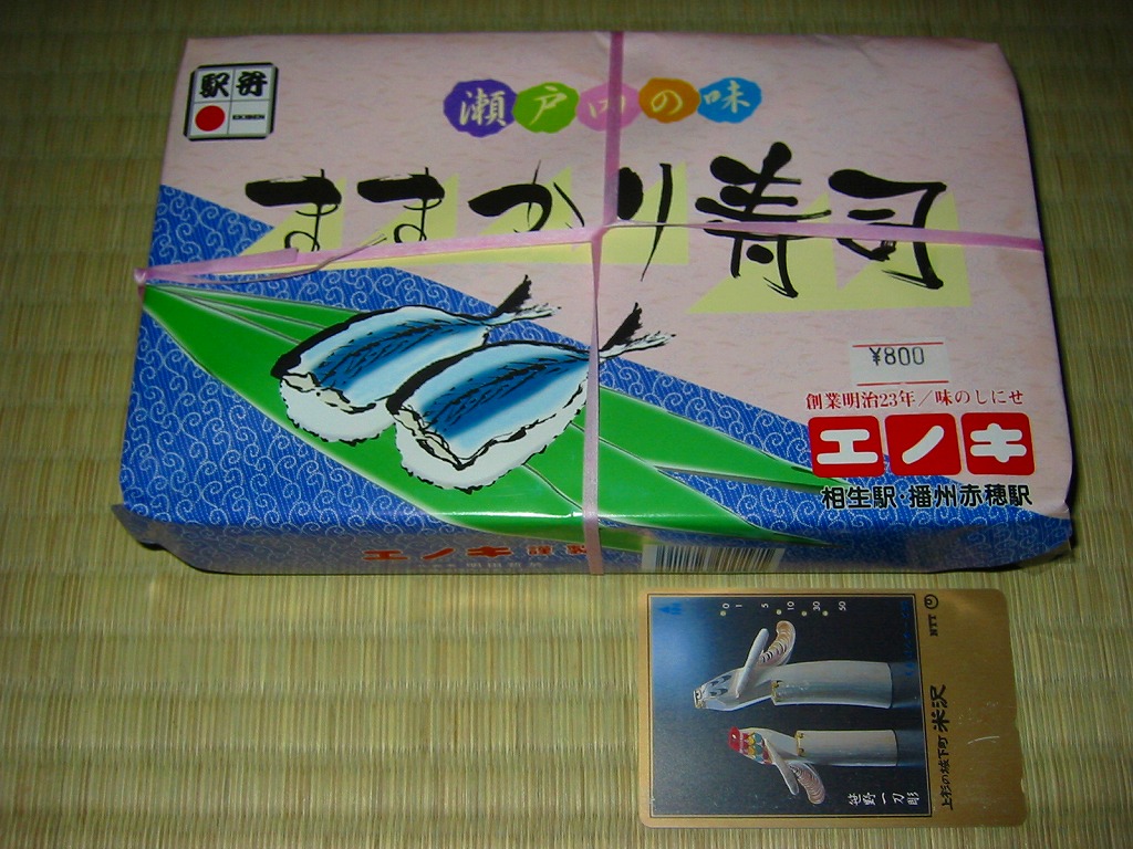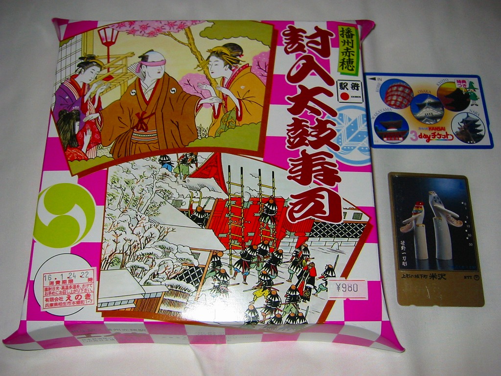 日本で何番目かの酒入り駅弁。それほど大きくないほぼ正方形の容器に、忠臣蔵を文字や背景で描いたボール紙のフタをして、ビニールひもでしばる。中身は穴子と海老とたぶんママカリの寿司、大根の酢の物、海老やシシトウなどの天ぷら、焼き魚・蒲鉾・玉子焼・煮物。中央にデンと座る清酒「忠臣蔵」を呑むための内容だろう。要予約。