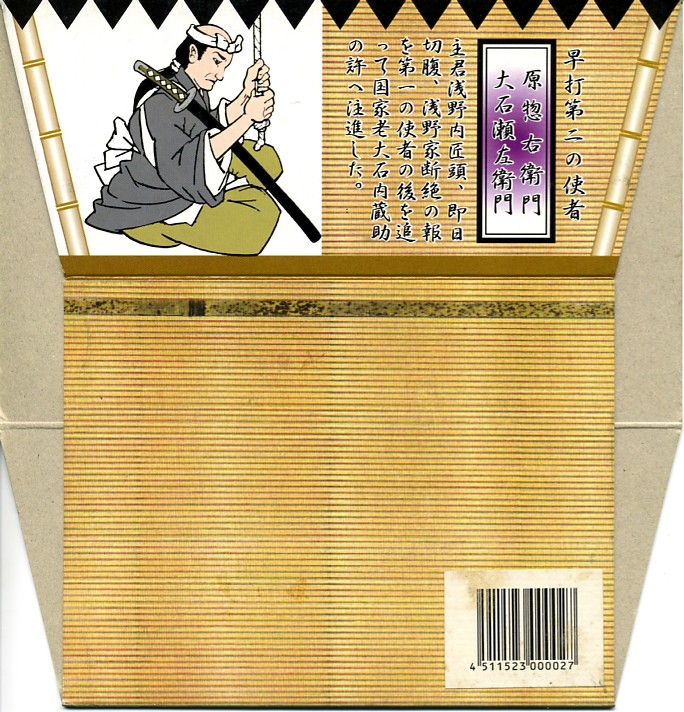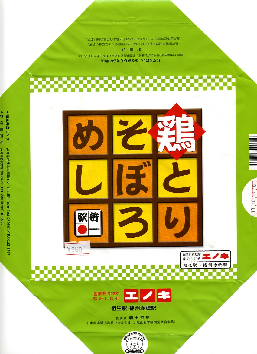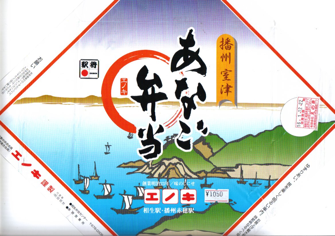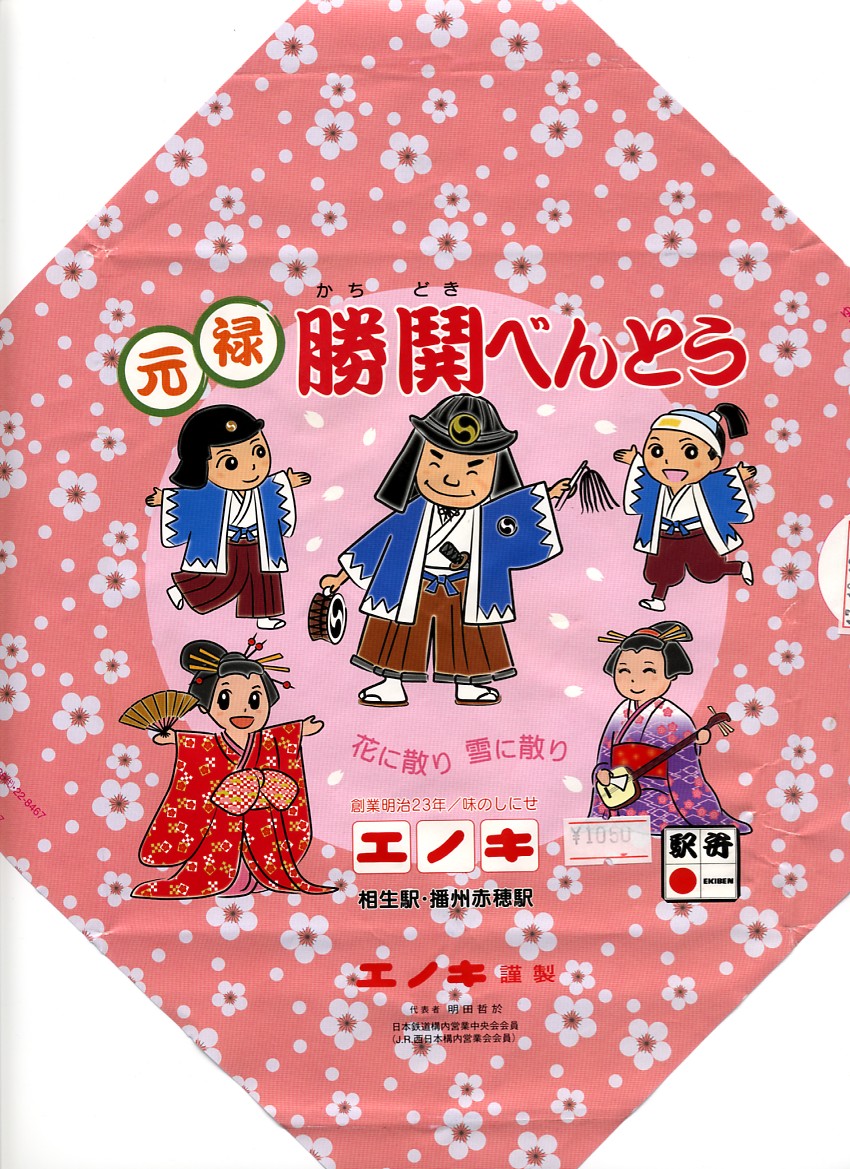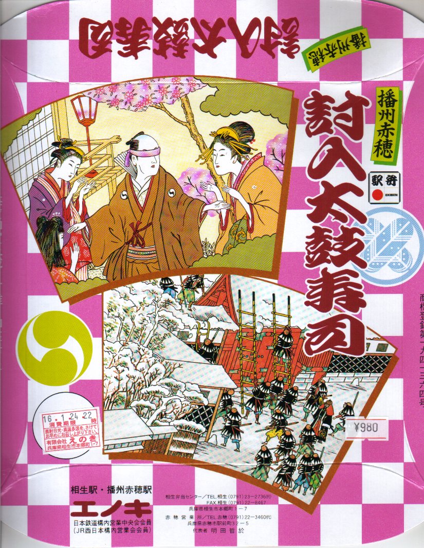 1978(昭和53)年8月1日の調製と思われる、昔の相生駅と播州赤穂駅の駅弁の掛紙。赤穂浪士両国橋引き揚げの図として、浮世絵の構図で舞台写真のような絵柄を掲載し、全47名の名前を列記した。中身は上等幕の内駅弁ではないかと思う。