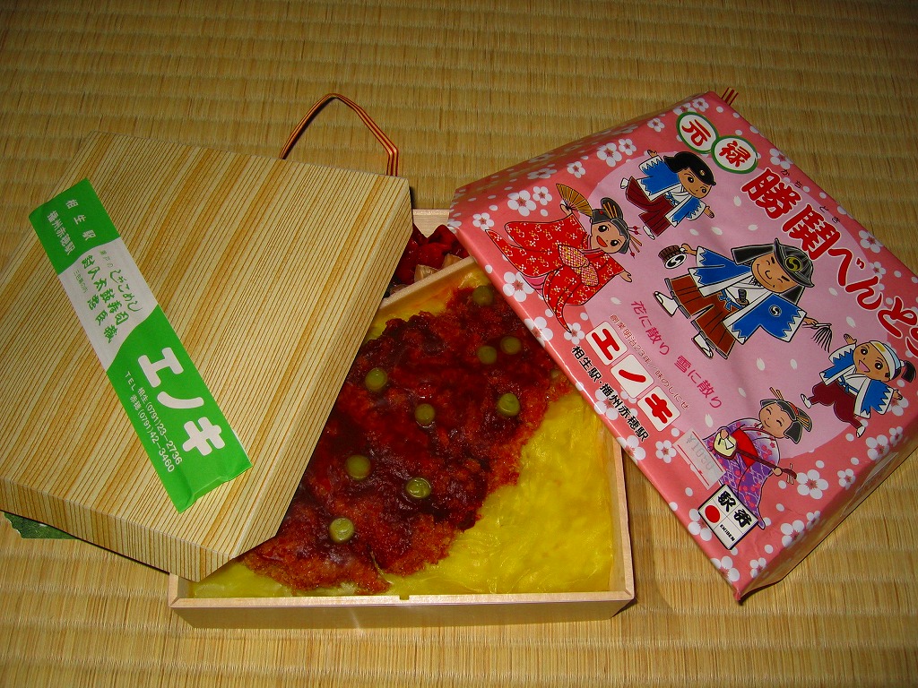 経木枠の正方形の容器に木目調の紙ぶたをかけて、昭和末期風マンガ柄の掛紙で包み、紙ひもでしばる。中身は御飯の上をキャベツで覆い、グリーンピースで彩ったロースカツを載せ、スパゲティなどを添えるもの。カツは硬く、キャベツを蛍光色に染める着色が気になったが、それも含めて全体で、昭和50年代頃の駅弁を体現していると思う。一日200個限定と紹介されるが、現地でそんなに売れるのかどうか。