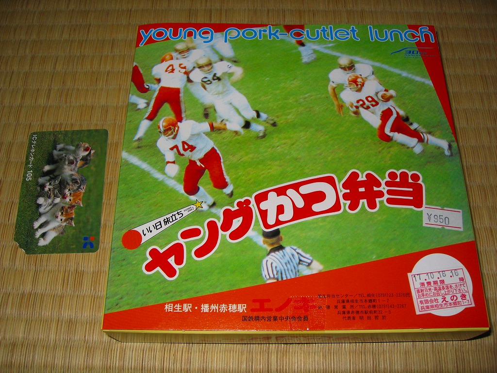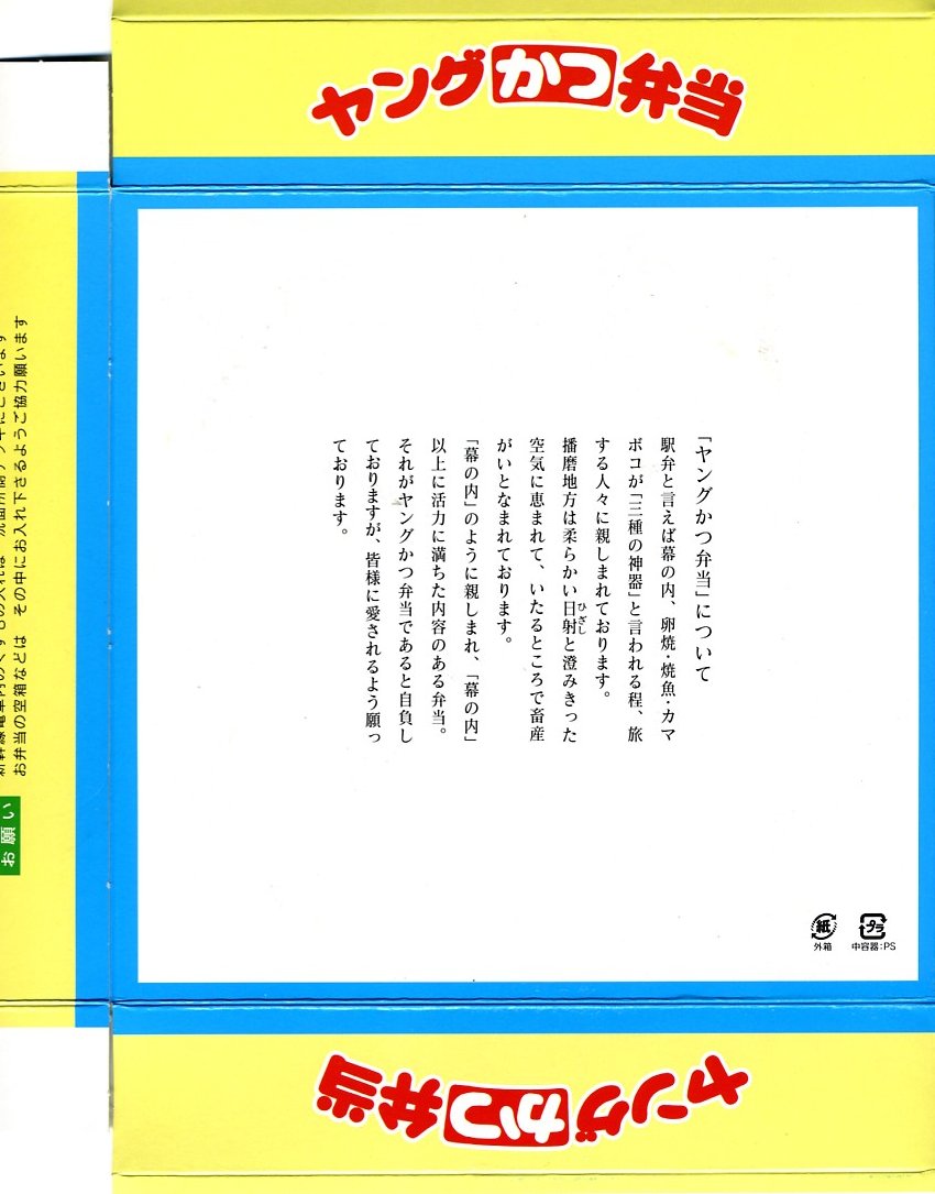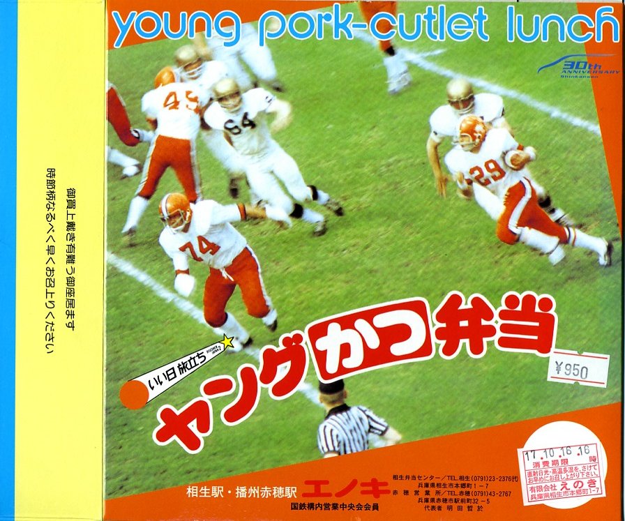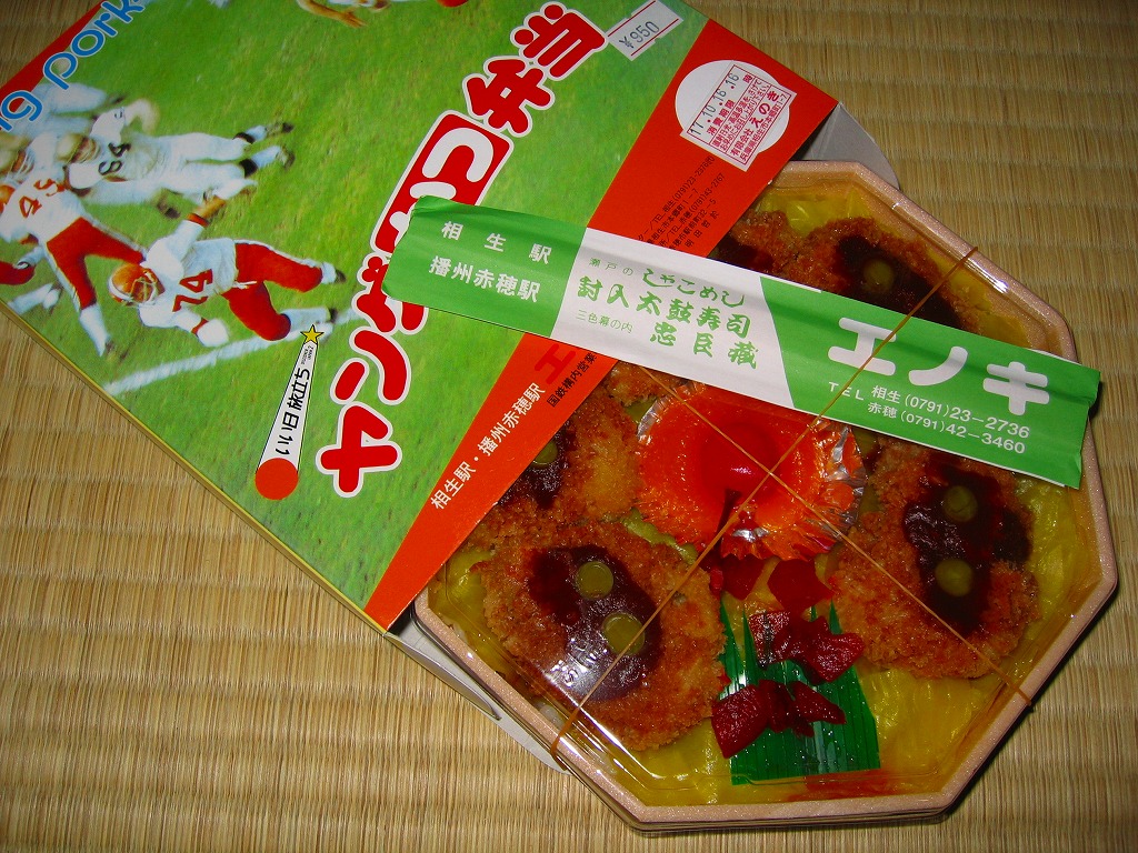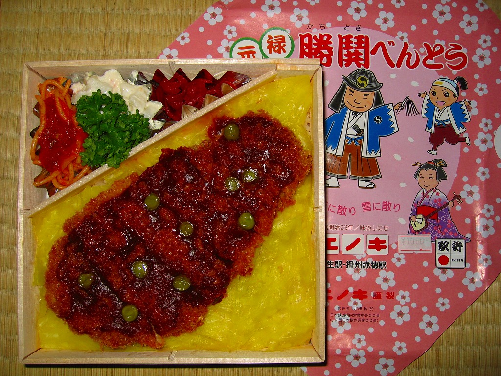 山陽新幹線開業30周年を記念して、その開業当時の駅弁を復刻し、2005(平成17)年1月23日から9月30日まで販売された、沿線全11駅弁の相生駅版。これは1975年から1981年頃まで販売されていた駅弁だそうな。正八角形の容器に透明なフタをして、そのすべてに三十年前を感じるデザインの紙箱に収める。中身は御飯の上をキャベツで覆い、ヤングに一口サイズのトンカツを五個配置し、中心に缶詰みかんとさくらんぼを添える。