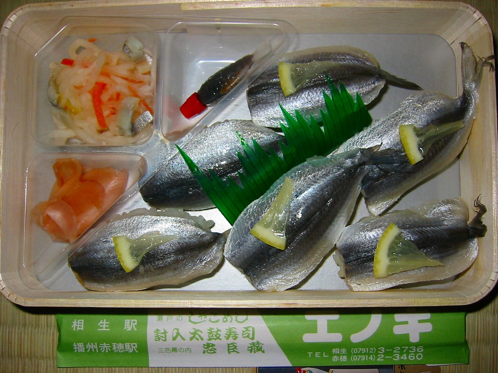 古風な形と大きさの経木枠の容器を、大きな掛紙で包み紙ひもでしばる。中身はつややかなママカリのにぎり寿司が6個、そのひとつひとつにレモンのかけらを載せて入り、その皮混じりの切干大根等が添えられる。岡山駅の同種駅弁と比較して、その駅や街の大きさが格段に小さい分だけ知名度で分が悪いが、品質はまったく劣らない。