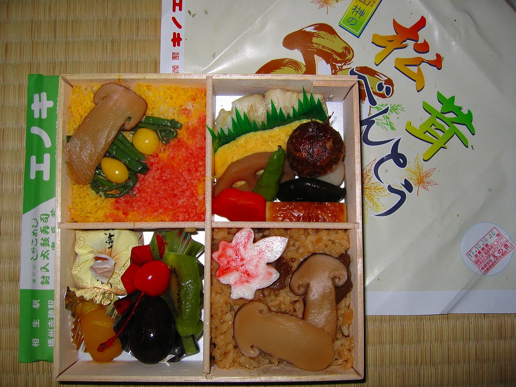 経木枠の正方形の容器に木目調の紙ぶたをかけて、松茸を漢字とイラストで描いた掛紙で包み、紙ひもでしばる。中身は松花堂風に四分割され、それぞれに松茸御飯、松茸ちらし、玉子焼・蒲鉾・焼き魚・煮物など、フルーツ四種と和菓子のデザート。