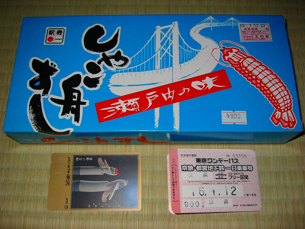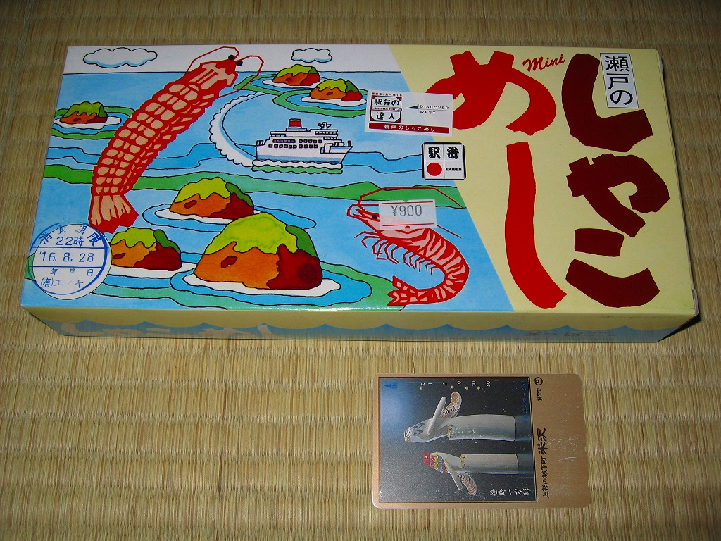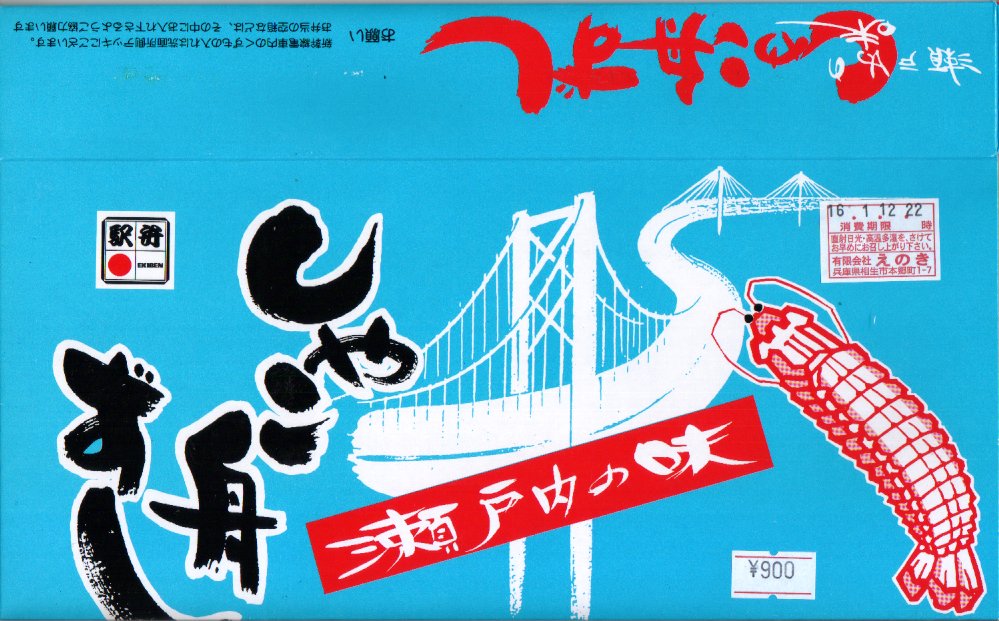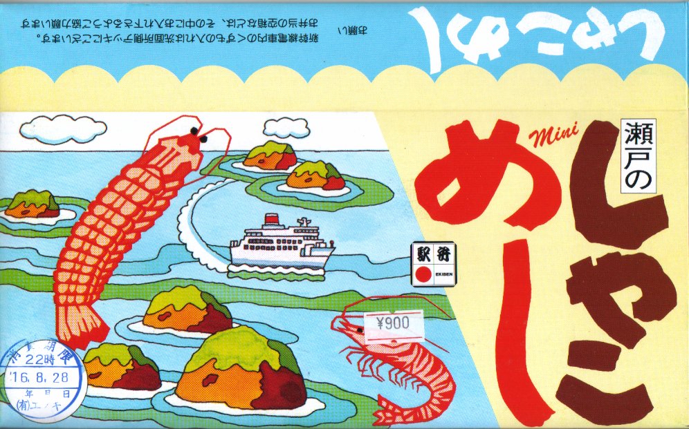 しゃこ漁に使う舟を模したという舟形の白いトレーに、透明なふたをして輪ゴムでしばり、青地に瀬戸大橋としゃこを描いたボール紙のパッケージに収納する。中身はしゃこ押寿司としゃこちらしずしとしゃこの河童巻。しゃこづくしながら、なかなかシンプル。言い換えるとやや地味か。新製品ではなく時刻表に掲載があるのに知名度はかなり低く、過去の紹介例がほとんどない模様。