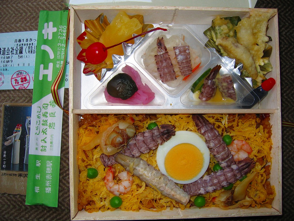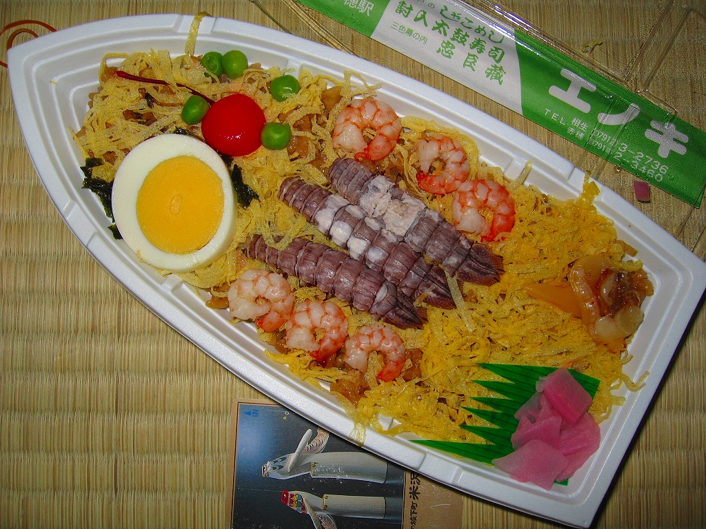 1971(昭和46)年に発売し、2000年前後にリニューアルされた模様。ボール紙のパッケージに舟型の薄手なプラスティックの容器が入る。中身は五目飯の上に錦糸卵を敷き詰めて、しゃこの酢味噌あえ・えび・ゆで卵・ひめ貝にグリーンピースやさくらんぼを配置するもの。全体的にふわりとした食感を持つ駅弁。