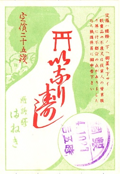 1929(昭和4)年10月27日17時の調製と思われる、昔の姫路駅弁の掛紙。鳥居とひょうたんで稲荷寿司という組合せは、当時の人々に分かりやすかったのではないかと思う。