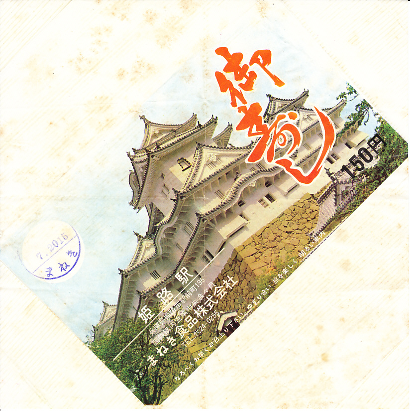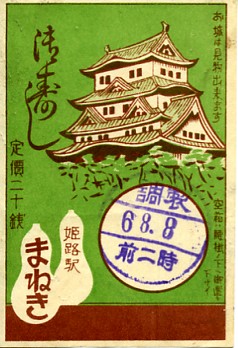 1960年代頃の7月20日15時の調製と思われる、昔の姫路駅弁の掛紙。写真はおなじみの姫路城だが、同時代の幕の内弁当の掛紙との区別を図ったのか、普段の大天守側でなく、反対側の乾小天守側から撮影されている。