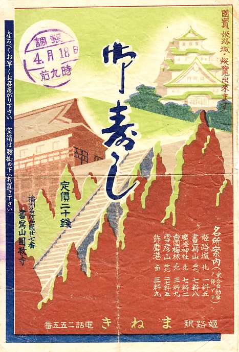 おそらく1930年代の、4月18日9時の調製と思われる、昔の姫路駅弁の掛紙。国寶姫路城と書寫山圓教寺と、これらを含む6か所の名所の列記でできている。姫路城は「縦覧出来ます」とアピール。