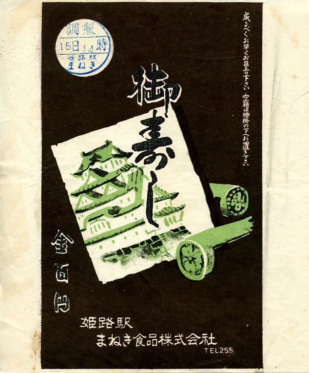 昭和30年代頃の15日14時の調製と思われる、昔の姫路駅弁の掛紙。価格と三桁の電話番号から年代を特定できないだろうか。やはり姫路駅弁は昔も今も姫路城。